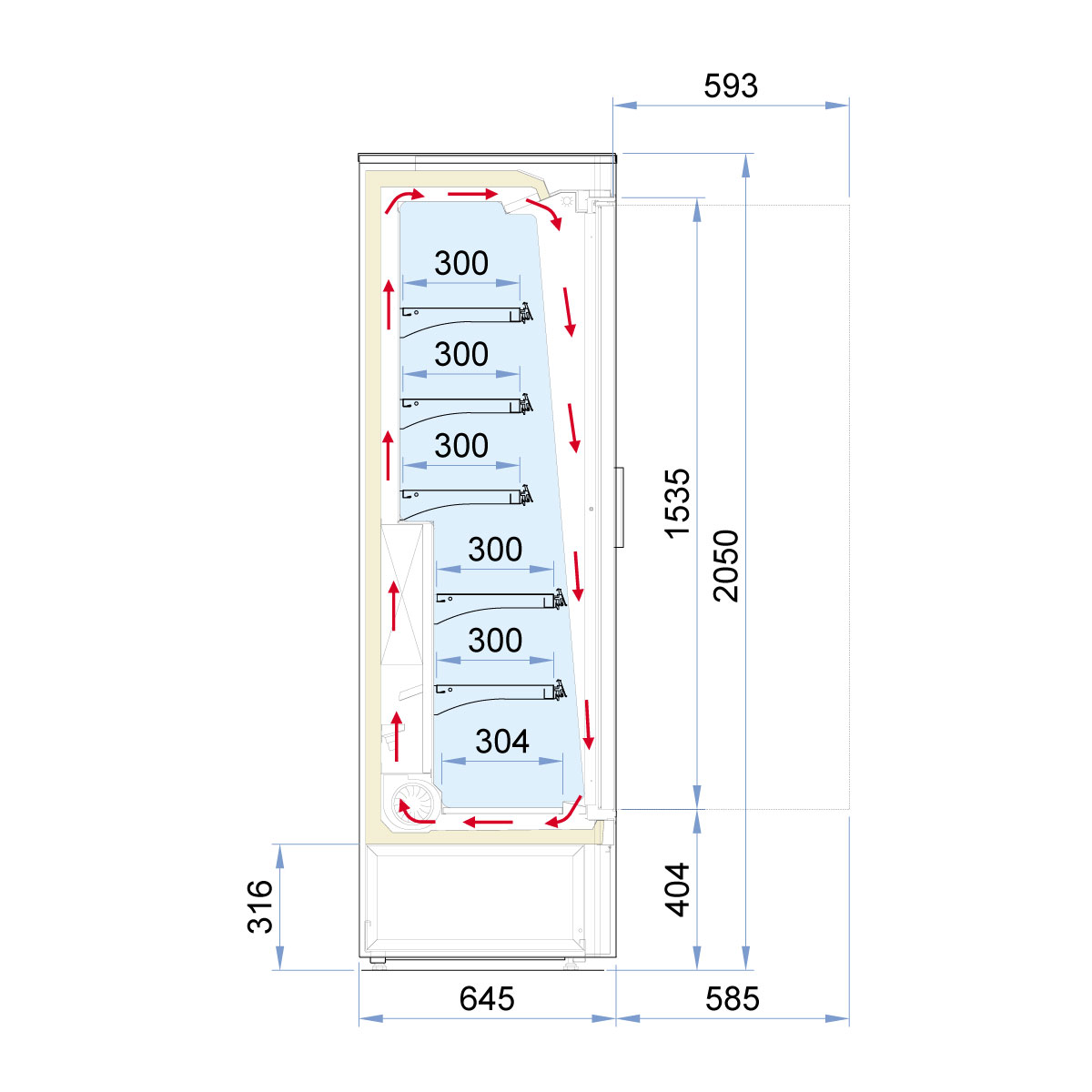 Εξωτερικές διαστάσεις 1226x645x2050(h)mm Χωρητικότητα 995 lt Θερμοκρασία 0ºC / +5ºC Ισχύς 850Watt / 230V / 50Hz Ψύξη Βεβιασμένη Απόψυξη Αυτόματη (με σταμάτημα συμπιεστή) Ψυκτικό υγρό R452a Συμπιεστής 1 (κλειστού τύπου) Ράφια 5 x 300mm Φωτισμός LED Κλιματική κλάση 3 (25oC & 60%RH) Βάρος 282 Kg Πανοραμικά πλαϊνά Ανοιγόμενες πόρτες με σύστημα επαναφοράς Ηλεκτρονικός θερμοστάτης - θερμόμετρο 4 ρυθμιζόμενα ποδαράκια