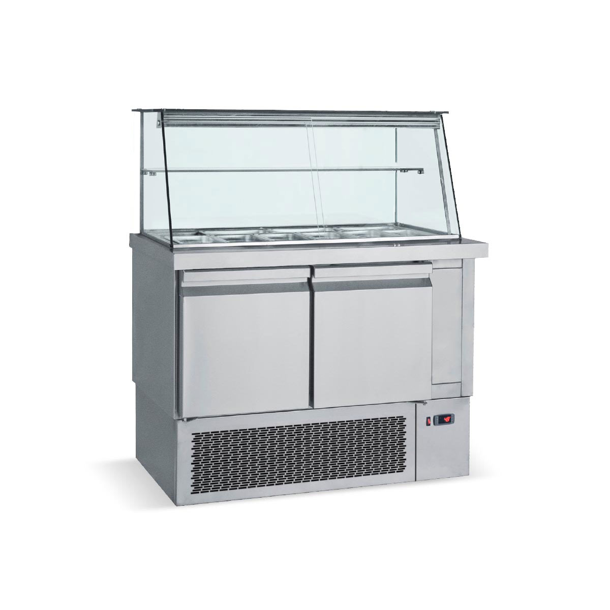 Κατασκευασμένο από ανοξείδωτο χάλυβα Μόνωση με οικολογική πολυουρεθάνη πάχους 5 cm Στοιχείο βαμμένο με αντιδιαβρωτική προστασία Πάτος με υγειονομικές γωνίες Πόρτες με αυτόματη επαναφορά κάτω από 90° Πόδια ανοξείδωτα ρυθμιζόμενα Σχάρες πλαστικοποιημένες ρυθμιζόμενες καθ’ ύψος Γυάλινο ράφι Βιτρίνα για τοποθέτηση λεκανών GN Φρέον οικολογικό
