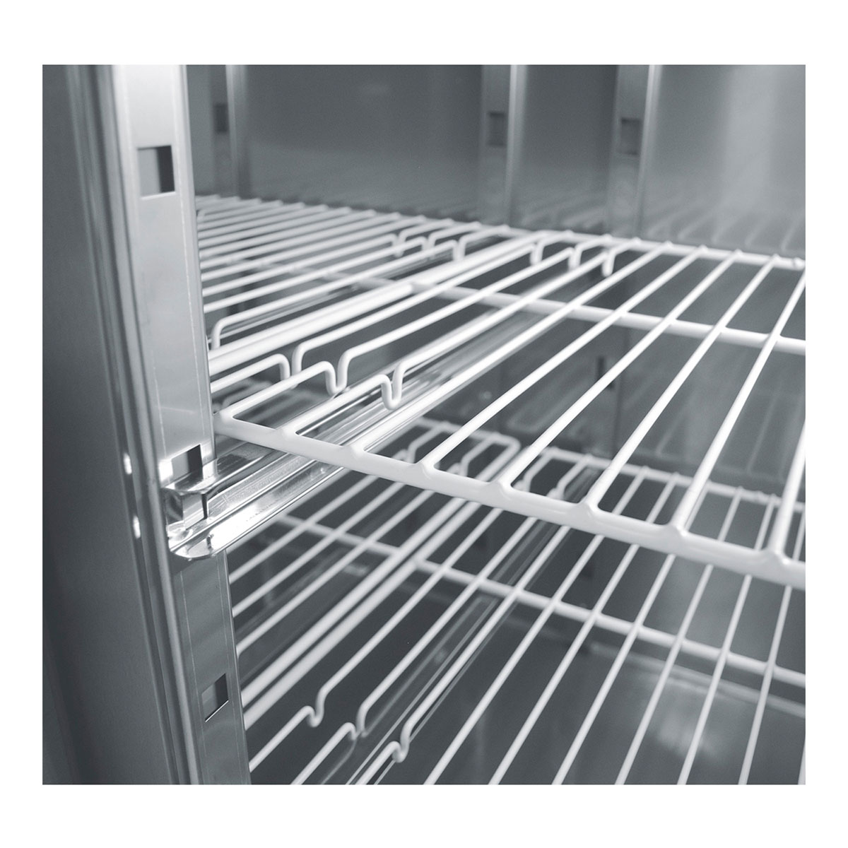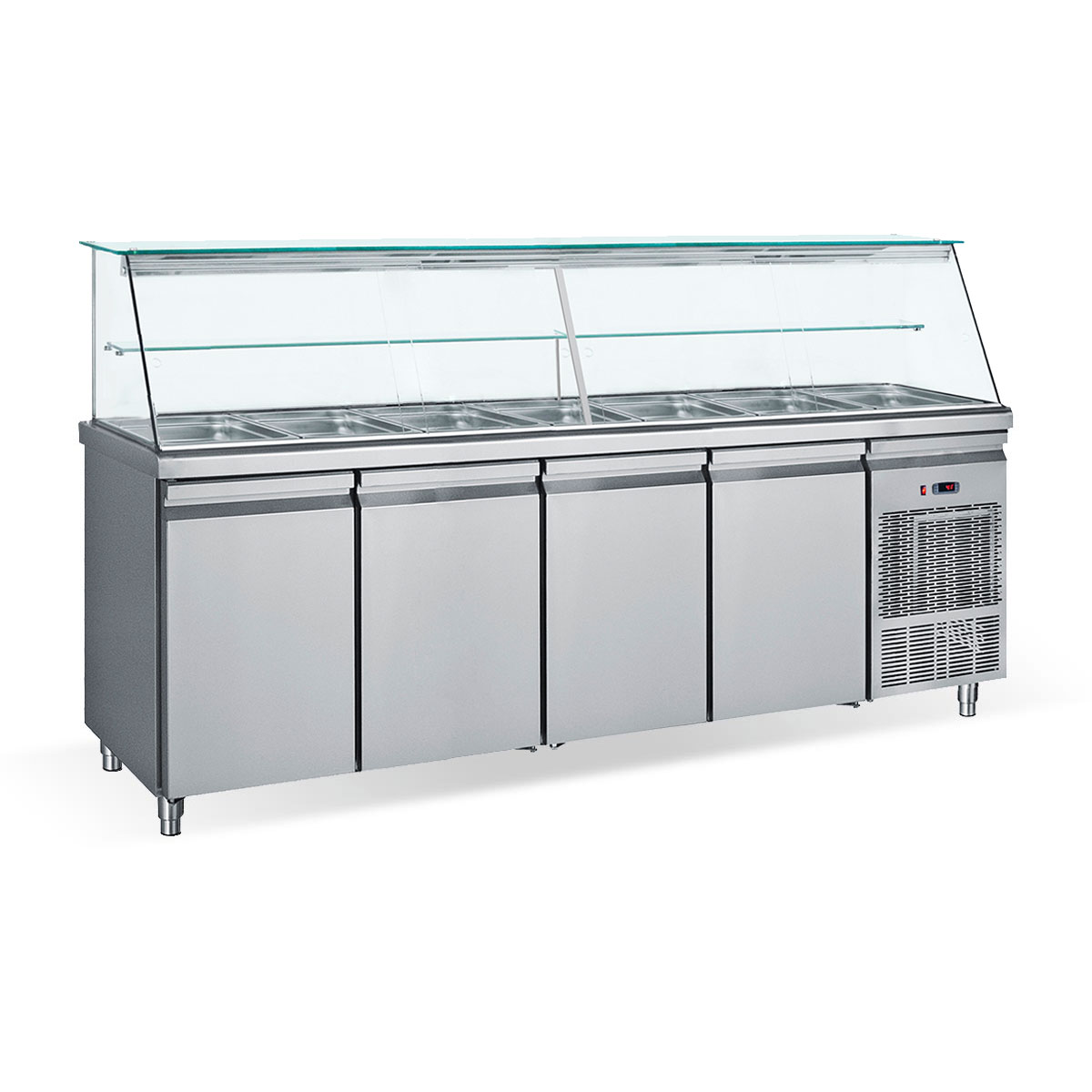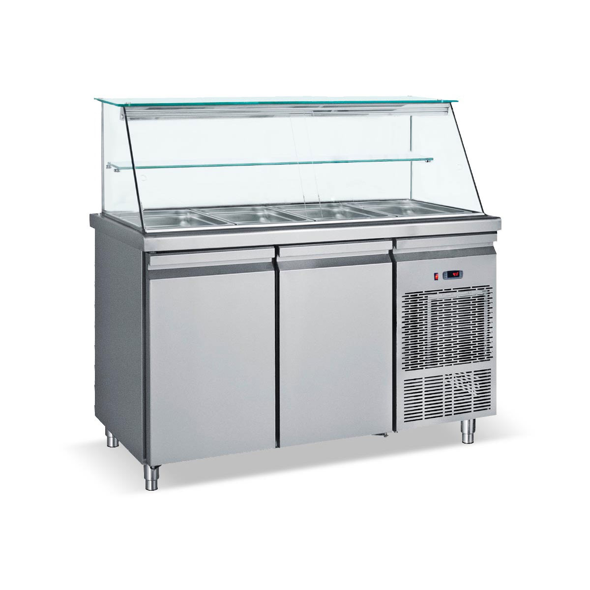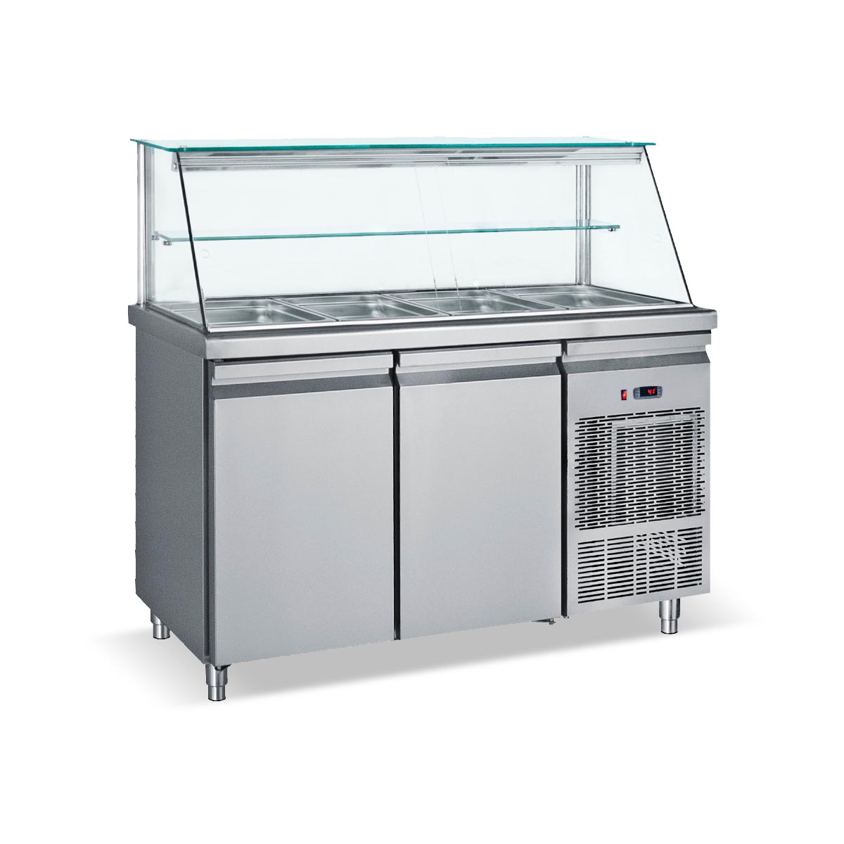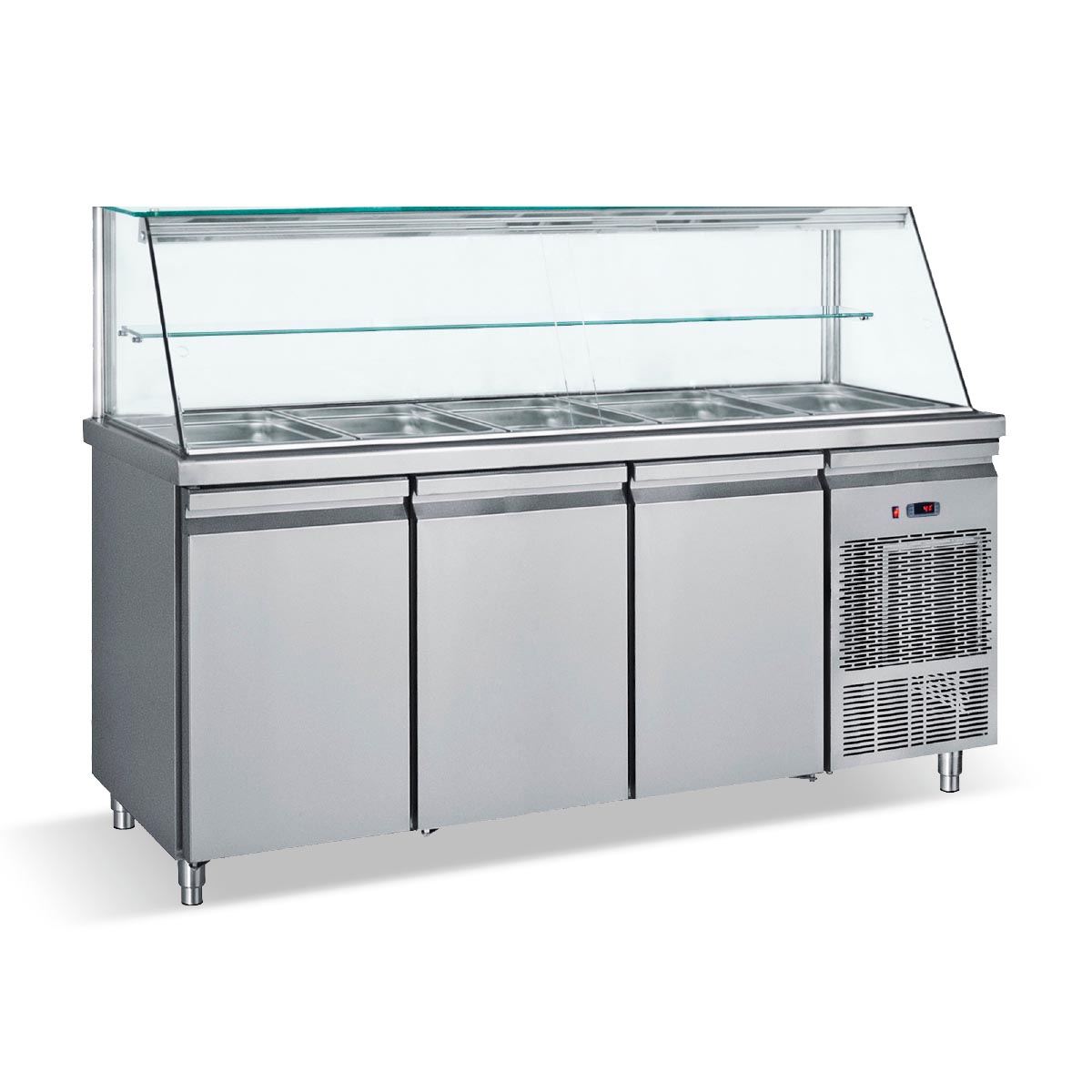 Κατασκευασμένο από ανοξείδωτο χάλυβα Βιτρίνα για τοποθέτηση λεκανών GN1/1 Στοιχείο βαμμένο με αντιδιαβρωτική προστασία Πάτος με υγειονομικές γωνίες Πόδια ανοξείδωτα ρυθμιζόμενα Σχάρες πλαστικοποιημένες ρυθμιζόμενες καθ’ ύψος Γυάλινο ράφι στη βιτρίνα Φρέον οικολογικό