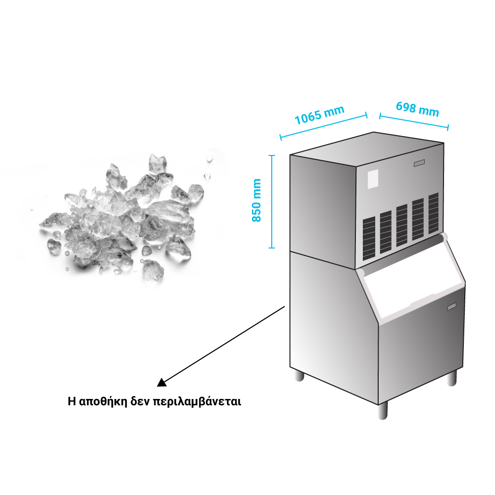 Διαστάσεις 1065x698x850(h)mm Παραγωγή σε 24h αερόψυκτη 1150 kg Ισχύς 3600 Watt, 400V / 3N/ 50Hz Ψυκτικό υγρό R452a Χωρίς ενσωματωμένη αποθήκη