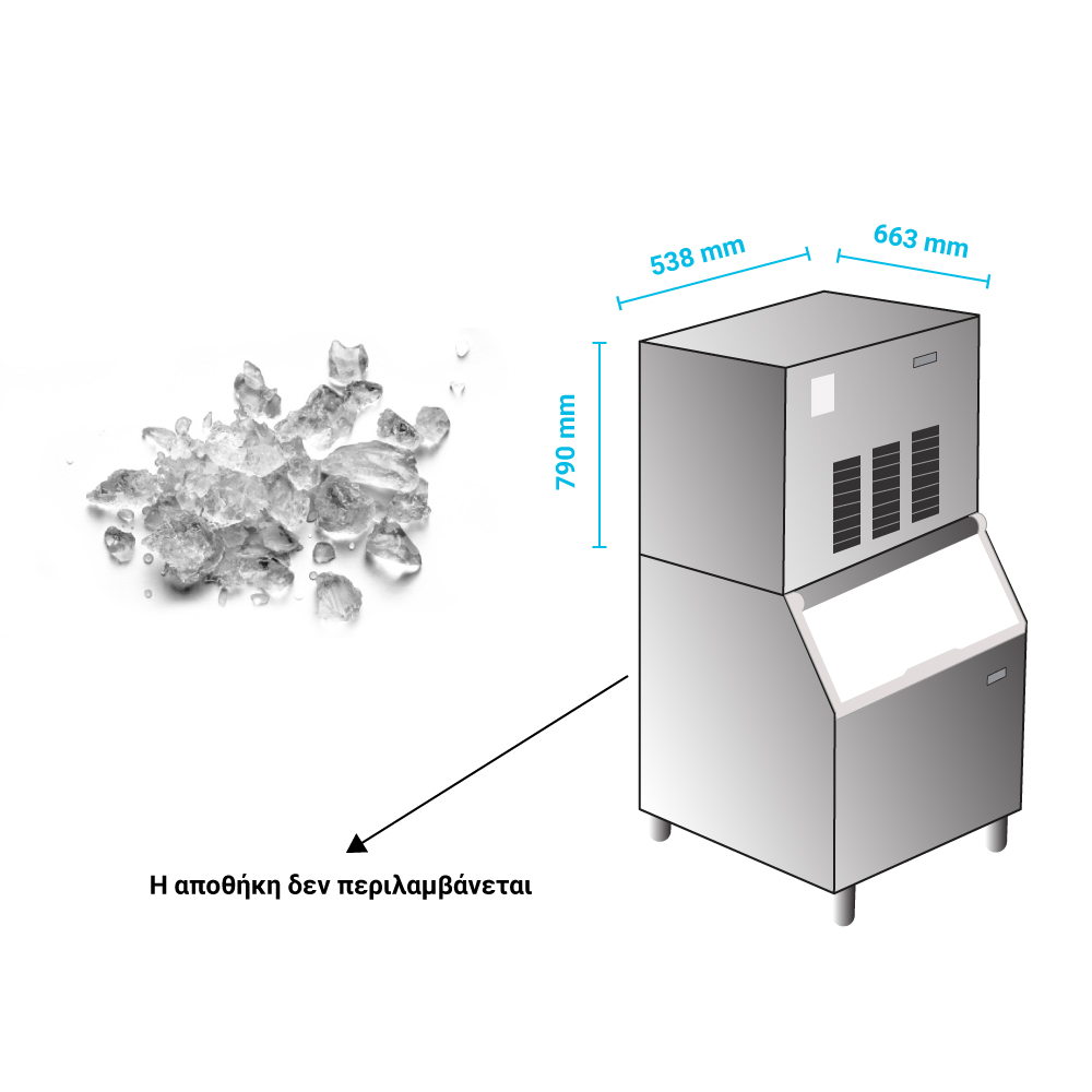 Διαστάσεις 538x663x790(h)mm Παραγωγή σε 24h αερόψυκτη 600 kg Ισχύς 2500 Watt , 400V / 3N / 50Hz Ψυκτικό υγρό R452a Χωρίς ενσωματωμένη αποθήκη