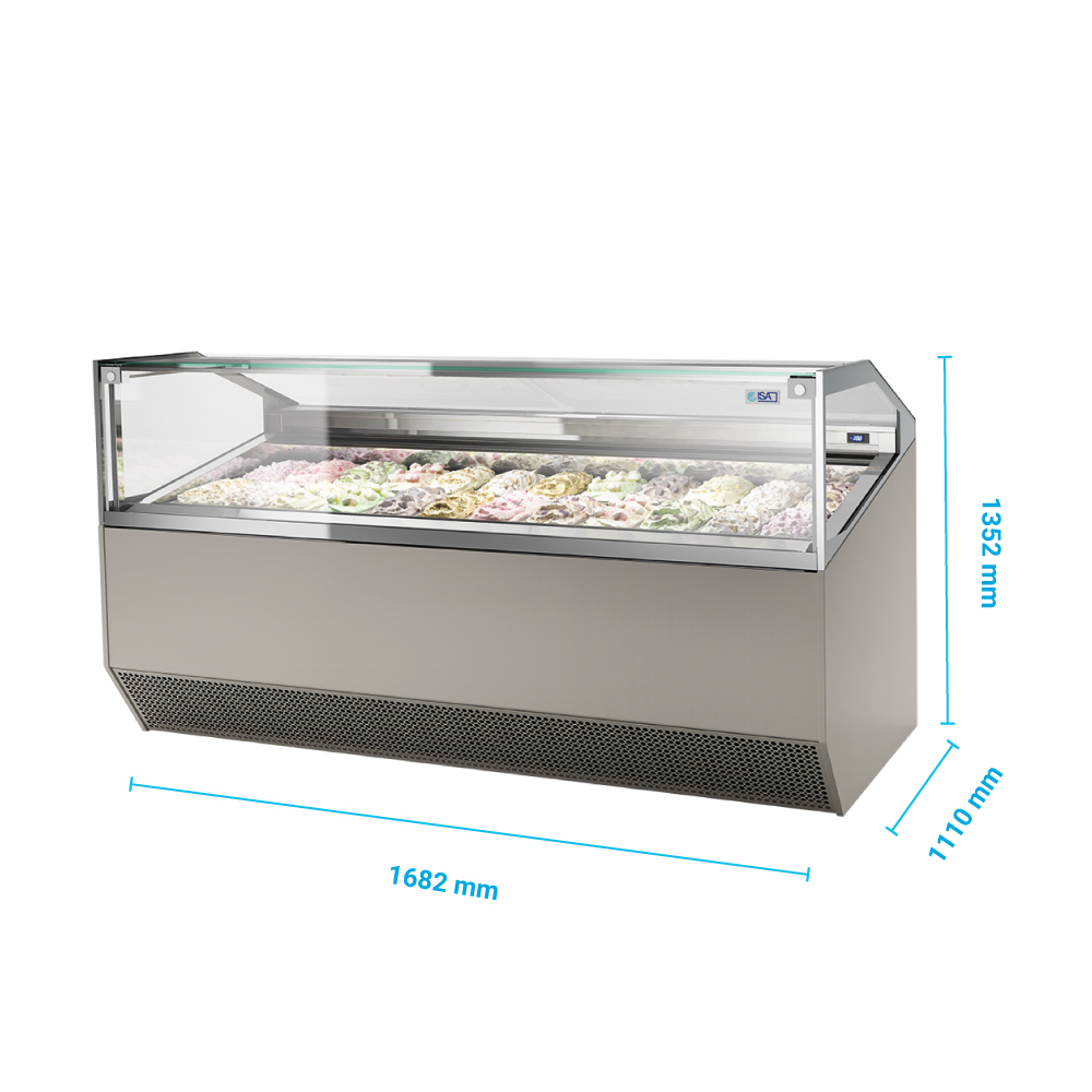 Διαστάσεις 1682x1110x1352(h)mm Χωρητικότητα 18 λεκανάκια (5lt) Βάση Ζαχαροπλαστικής 1541 x 720 mm Θερμοκρασία -20ºC / +2ºC Ισχύς 1720Watt / 400V / 50Hz Ψύξη Βεβιασμένη Απόψυξη Αυτόματη με αναστροφή κύκλου Ψυκτικό υγρό R290 (plus) Συμπιεστής 2 (κλειστού τύπου) Κλιματική κλάση 7(30oC & 55%RH) Plus Βάρος 434 Κg Κρύσταλλο ασφαλείας , επίπεδο , ανοιγόμενο μπροστά και αντιθαμβωτικό Συρόμενα plexi glass πίσω ή κουρτίνα νυκτός με μαγνήτη Ηλεκτρονικός πίνακας λειτουργιών Φωτισμός LED Ρυθμιζόμενα πόδια ΤΑ ΛΕΚΑΝΑΙΑ ΠΑΓΩΤΟΥ ΔΕΝ ΣΥΜΠΕΡΙΛΑΜΒΑΝΟΝΤΑΙ