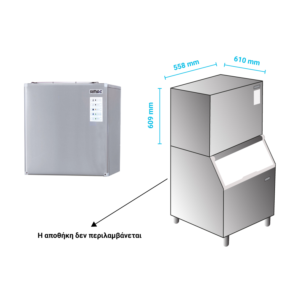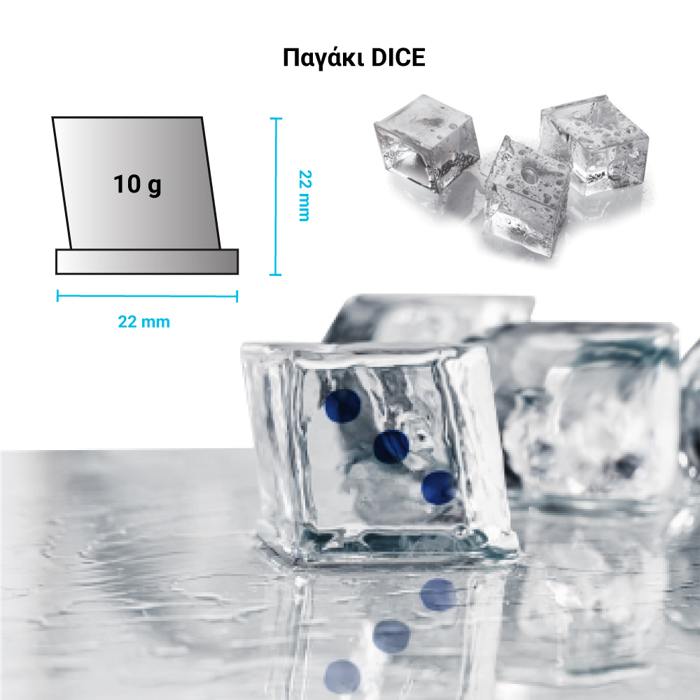 Διαστάσεις 558x610x609(h)mm Παραγωγή σε 24h αερόψυκτη 160 kg Ισχύς 950 Watt Παγάκι Dice 10 gr Ψυκτικό υγρό R452a Βάρος 53 Kg Χωρίς ενσωματωμένη αποθήκη