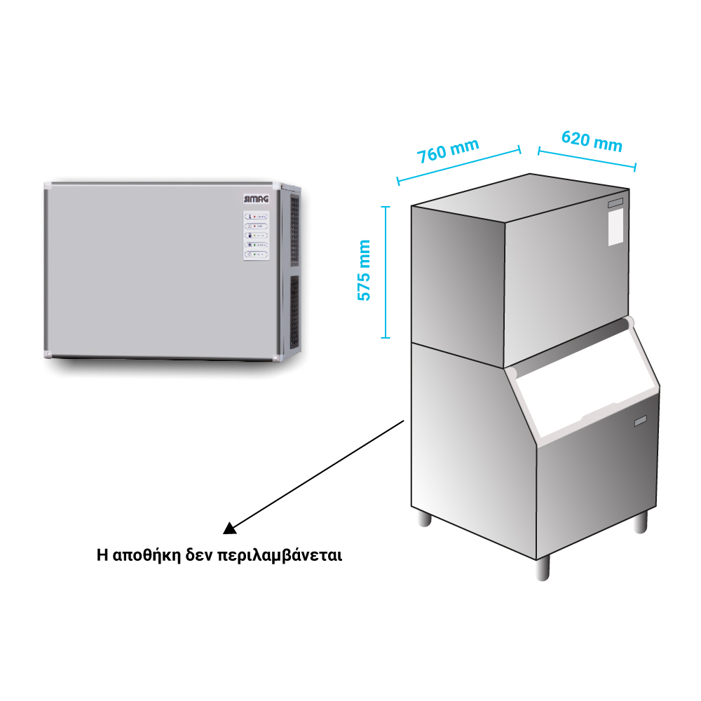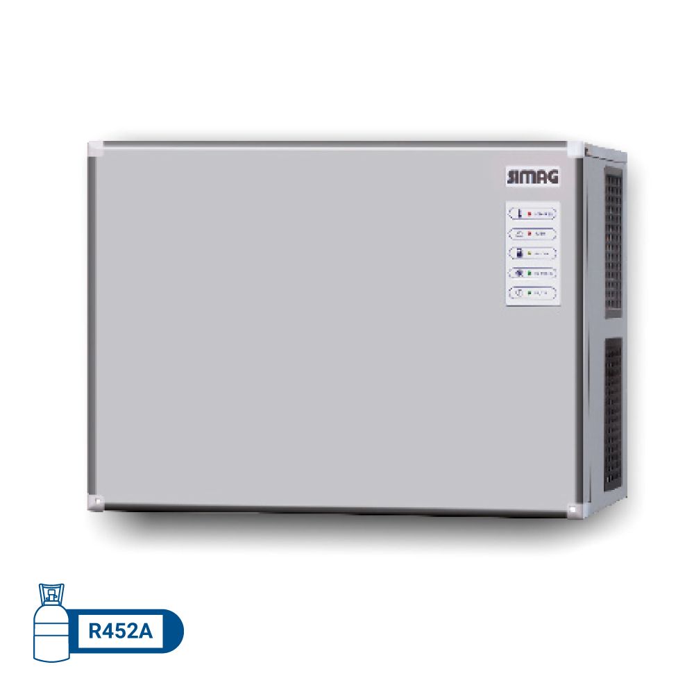 Διαστάσεις 760x620x575(h)mm Παραγωγή σε 24h αερόψυκτη 290 kg Ισχύς 1600 Watt Παγάκι Dice 10 gr Ψυκτικό υγρό R452a Βάρος 72 Kg Χωρίς ενσωματωμένη αποθήκη