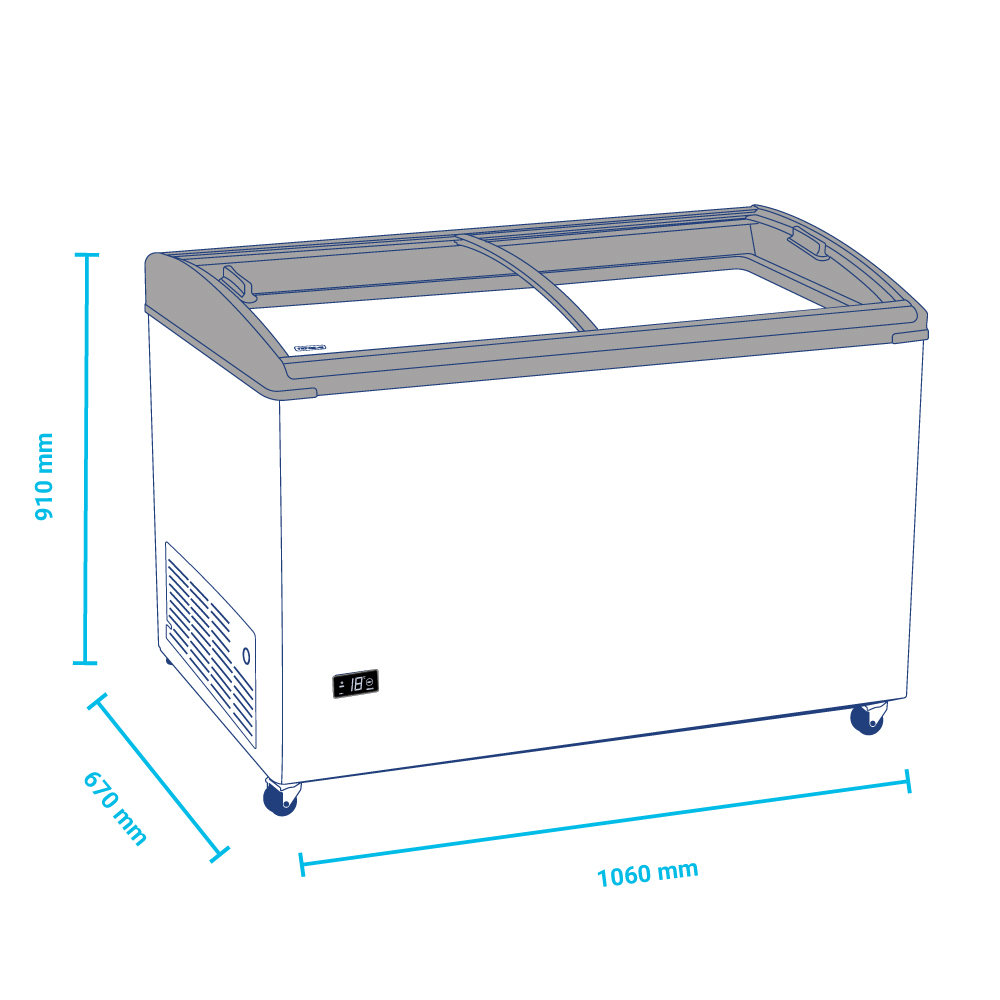 Εξωτερικές διαστάσεις 1060x670x910(h)mm Χωρητικότητα 310 lt Θερμοκρασία -22ºC / -9ºC Ισχύς 135Watt / 220-240V / 50Hz Ψύξη Στατική Απόψυξη Χειροκίνητη Ψυκτικό υγρό R600a Κλιματική κλάση 4 (30°C & 55%RH) Βάρος 52 Κg Προδιαγραφές Tropical 4 Ρόδες πολλαπλής κατεύθυνσης