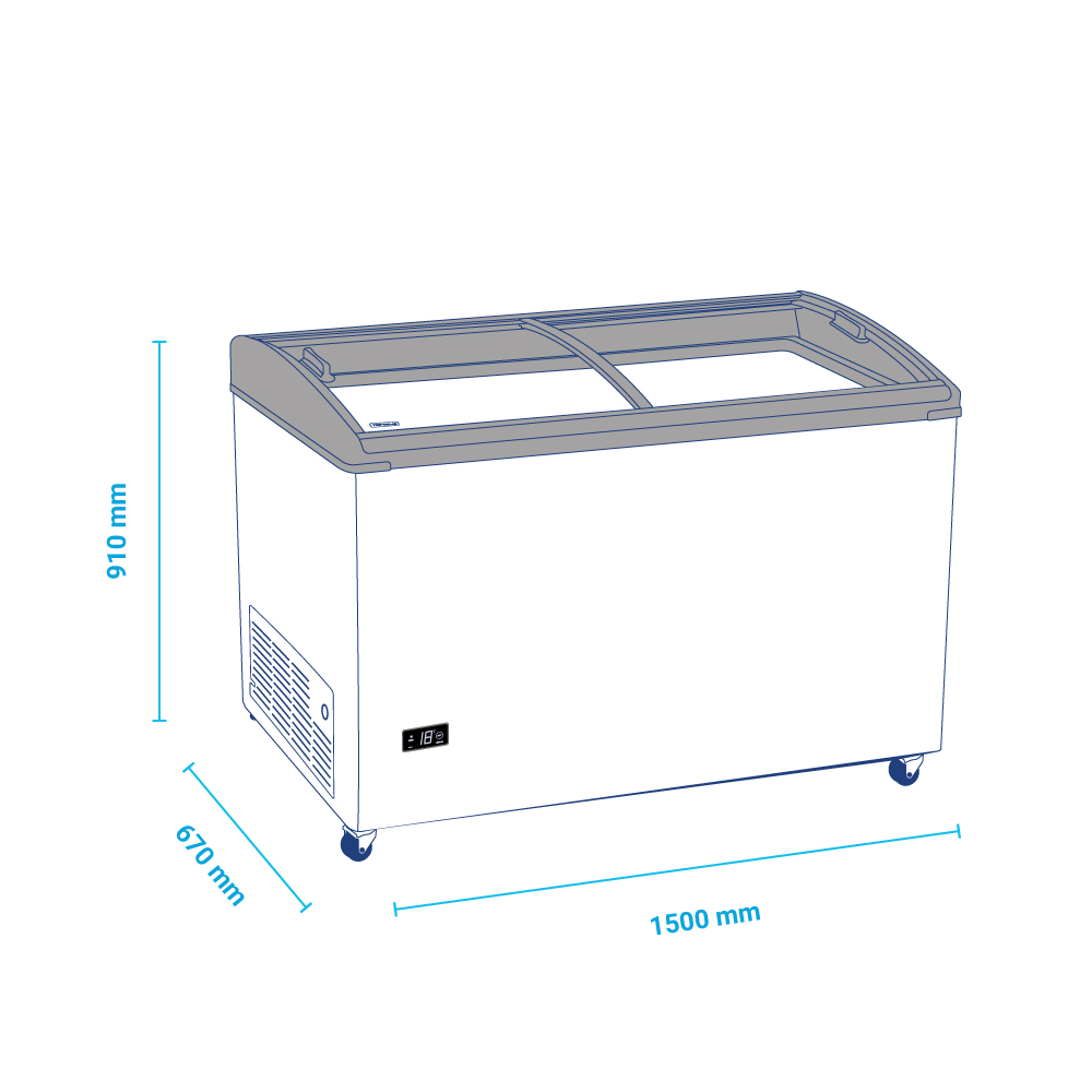 Εξωτερικές διαστάσεις 1500x670x910(h)mm Χωρητικότητα 477 lt Θερμοκρασία -22ºC / -9ºC Ισχύς 190Watt / 220-240V / 50Hz Ψύξη Στατική Απόψυξη Χειροκίνητη Ψυκτικό υγρό R600a Κλιματική κλάση 4 (30°C & 55%RH) Βάρος 58 Κg Προδιαγραφές Tropical 4 Ρόδες πολλαπλής κατεύθυνσης