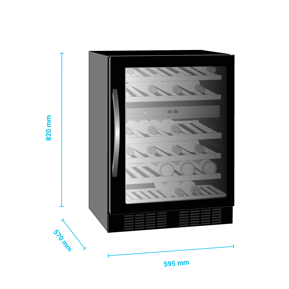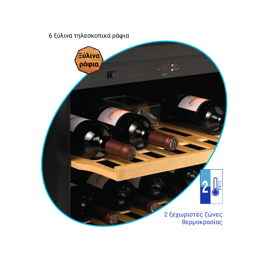 Εξωτερικές διαστάσεις 595x570x820(h)mm Εσωτερικές διαστάσεις 520x445x605(h)mm Χωρητικότητα 155 lt / 46 μπουκάλια (750ml) Θερμοκρασία +5ºC / +10ºC & +10ºC / +18ºC Ισχύς 160Watt / 220-240V / 50Hz Ψύξη Υποβοηθούμενη με ανεμιστήρα Απόψυξη Αυτόματη Ψυκτικό υγρό R600a Ράφια 6 ξύλινα συρόμενα προς τα έξω Φωτισμός LED Κλιματική κλάση 4 (+30°C & 55%RH) Καθαρό Βάρος 44 Kg Ηλεκτρονικός θερμοστάτης - θερμόμετρο Δυνατότητα αναστροφής φοράς πόρτας 4 ποδαράκια ρυθμιζόμενα Κλειδαριά
