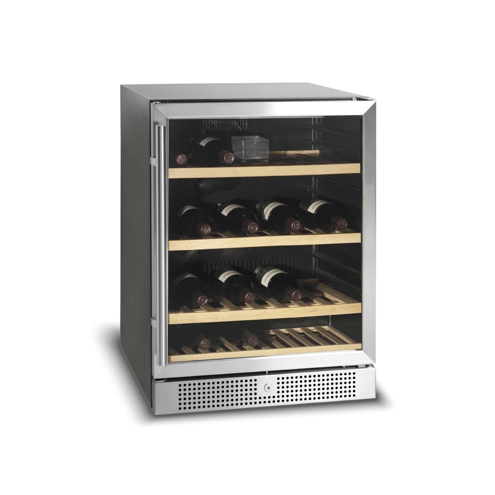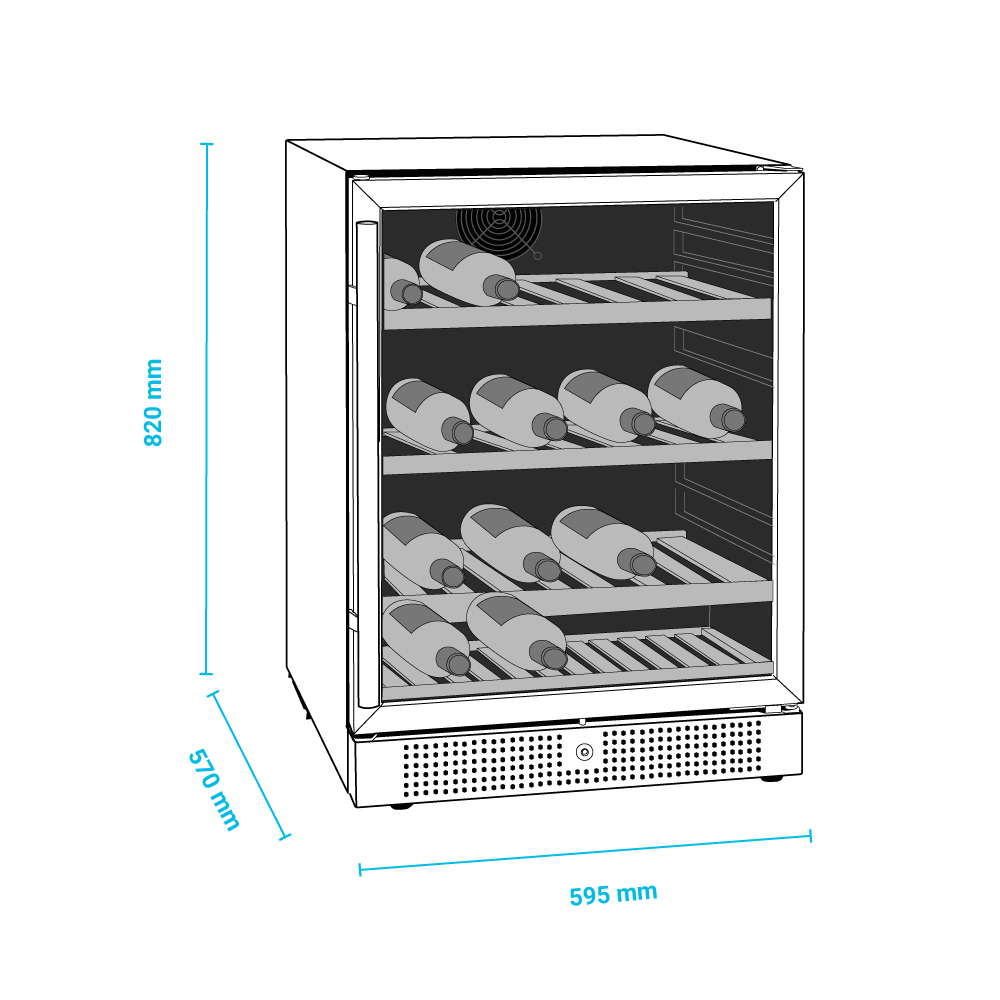 Εξωτερικές διαστάσεις 595x570x820(h)mm Εσωτερικές διαστάσεις 520x445x605(h)mm Χωρητικότητα 155 lt / 48 μπουκάλια (750ml) Θερμοκρασία +5ºC / +18 οC Ισχύς 160Watt / 220-240V / 50Hz Ψύξη Υποβοηθούμενη με ανεμιστήρα Απόψυξη Αυτόματη Ψυκτικό υγρό R600a Ράφια 4 ξύλινα συρόμενα προς τα έξω Φωτισμός LED Κλιματική κλάση 4 (+30°C & 55%RH) Βάρος 49 Kg Ηλεκτρονικός θερμοστάτης - θερμόμετρο Δυνατότητα αναστροφής φοράς πόρτας 4 ποδαράκια ρυθμιζόμενα Κλειδαριά