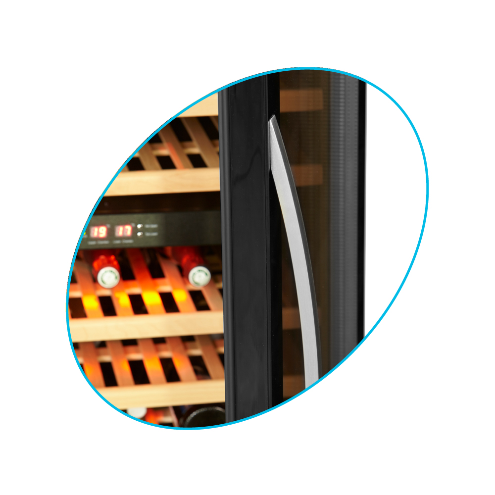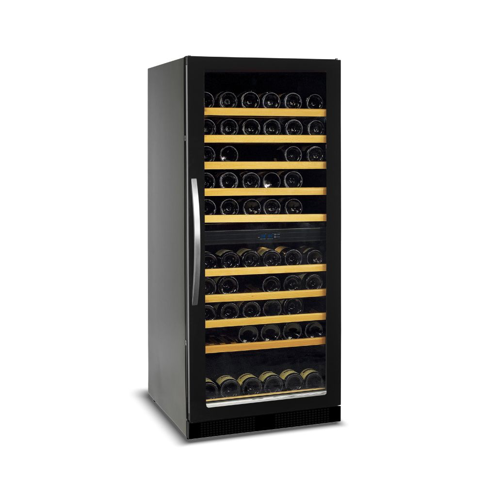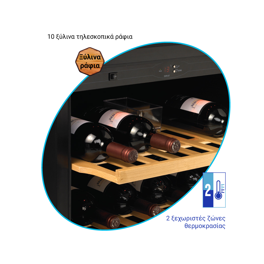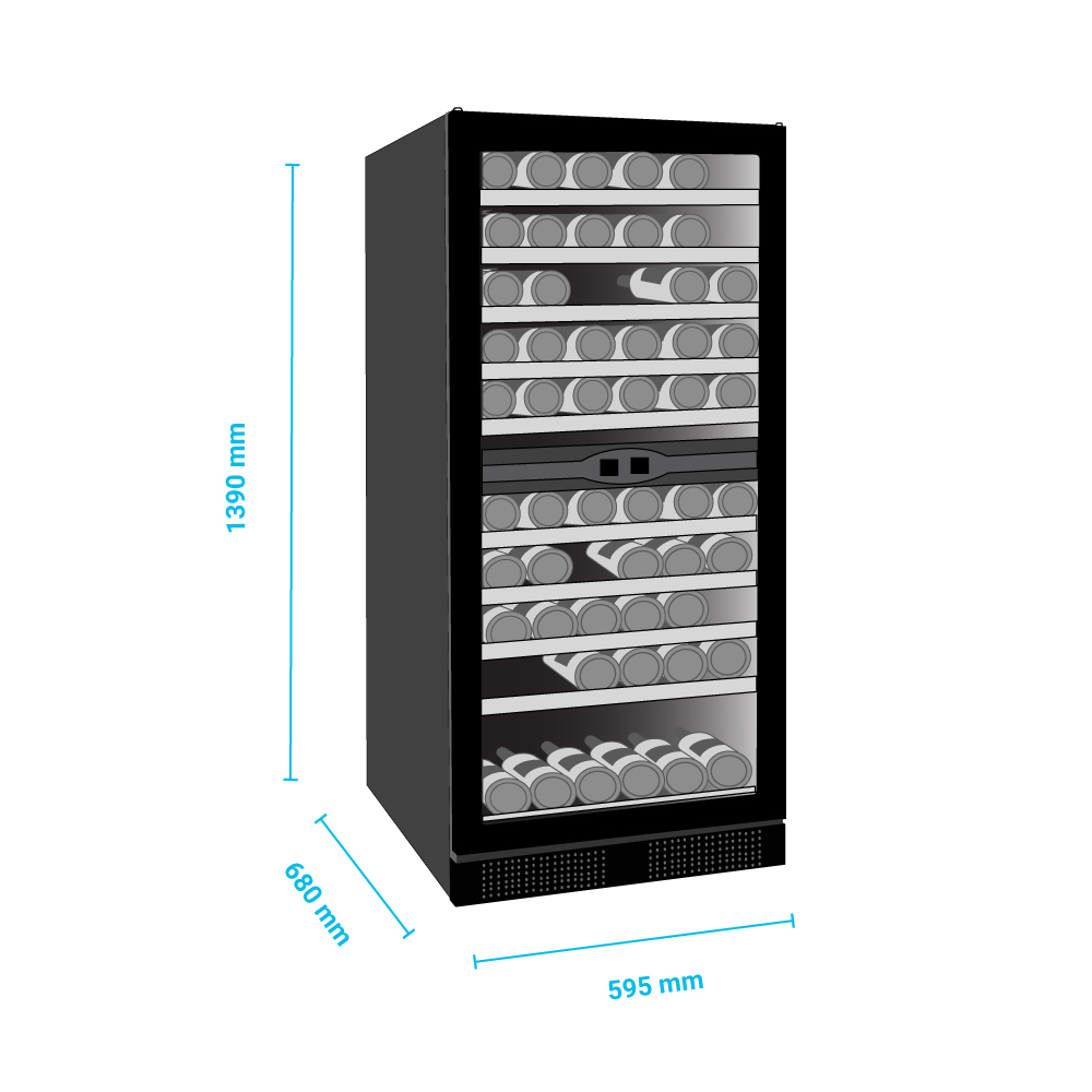 Εξωτερικές διαστάσεις 595x680x1390(h)mm Εσωτερικές διαστάσεις 510x540x1130(h)mm Χωρητικότητα 270 lt / 119 μπουκάλια (750ml) Θερμοκρασία +5ºC / +10ºC & +10ºC / +18ºC Ισχύς 155Watt / 220-240V / 50Hz Ψύξη Υποβοηθούμενη με ανεμιστήρα Απόψυξη Αυτόματη Ψυκτικό υγρό R600a Ράφια 10 ξύλινα συρόμενα προς τα έξω Φωτισμός LED Κλιματική κλάση 4 (+30°C & 55%RH) Βάρος 94 Kg Ηλεκτρονικός θερμοστάτης - θερμόμετρο Δυνατότητα αναστροφής φοράς πόρτας 4 ποδαράκια ρυθμιζόμενα Κλειδαριά