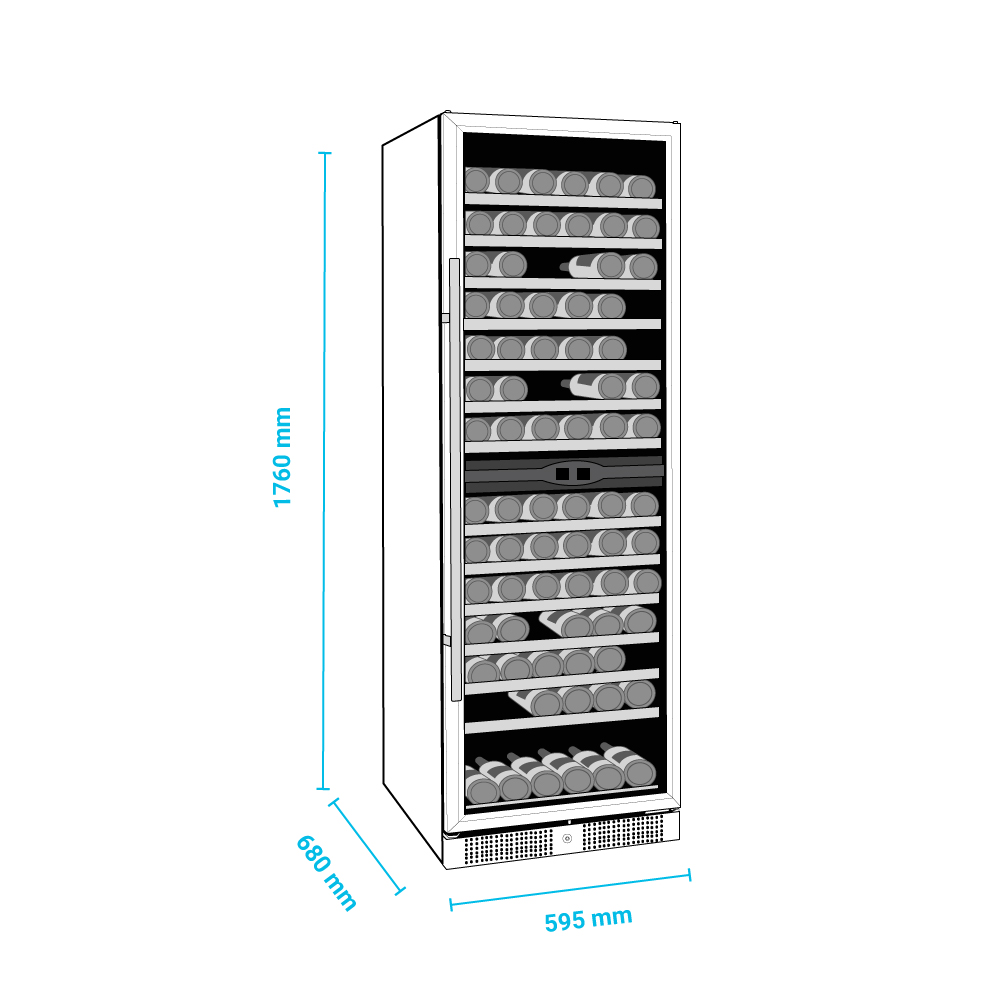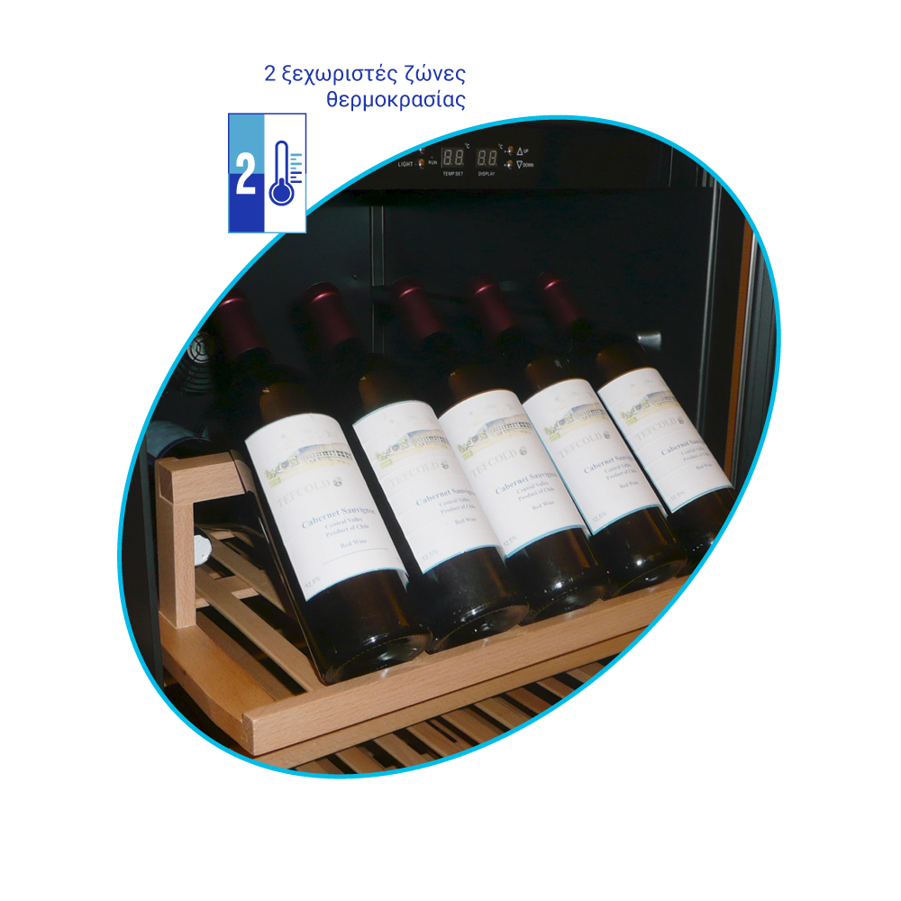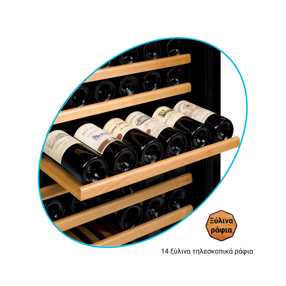 Εξωτερικές διαστάσεις 595x680x1760(h)mm Εσωτερικές διαστάσεις 515x532x1585(h)mm Χωρητικότητα 416 lt / 163 μπουκάλια (750ml) Θερμοκρασία +5ºC/+10ºC & +10ºC/+18οC Ζώνες θερμοκρασίας 2 Ισχύς 220Watt / 220-240V / 50Hz Ψύξη Υποβοηθούμενη με ανεμιστήρα Απόψυξη Αυτόματη Ψυκτικό υγρό R600a Ράφια 14 ξύλινα συρόμενα προς τα έξω Φωτισμός LED Κλιματική κλάση 4 (+30°C & 55%RH) Βάρος 111 Kg Ηλεκτρονικός θερμοστάτης - θερμόμετρο Δυνατότητα αναστροφής φοράς πόρτας 4 πόδια ρυθμιζόμενα Κλειδαριά