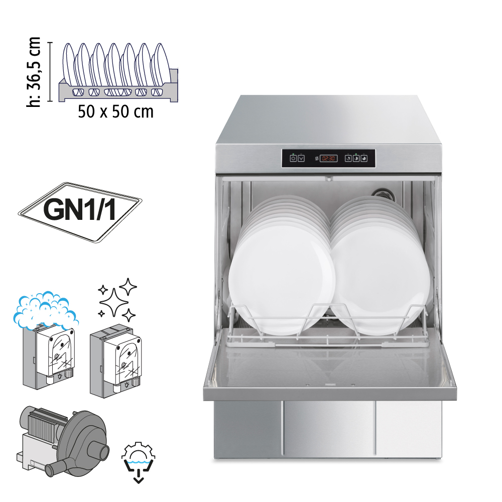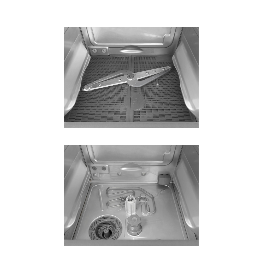 Διαστάσεις 578x598x820(h)mm Άνοιγμα πόρτας 365 mm Καλάθι 500x500 mm Προγράμματα 90 / 150 / 240 sec Συνολική Ισχύς 5,65Kw / 400V / 3N / 50Hz Αντίσταση κάδου 2000 Watt Αντίσταση Boiler 4960 Watt Αντλία πλύσης 0,68 KWatt Δυνατότητα μετατροπής σε μονοφασικο : (3.2Kwatt/230V/50Hz) Με ηλεκτρικό δοσομετρητή στεγνωτικού - απορρυπαντικού Με αντία εξαγωγής Συμπεριλαμβάνονται: 1 καλάθι γενικής χρήσης & 1 καλάθι πιάτων & 1 διπλή θήκη για μαχαιροπήρουνα.