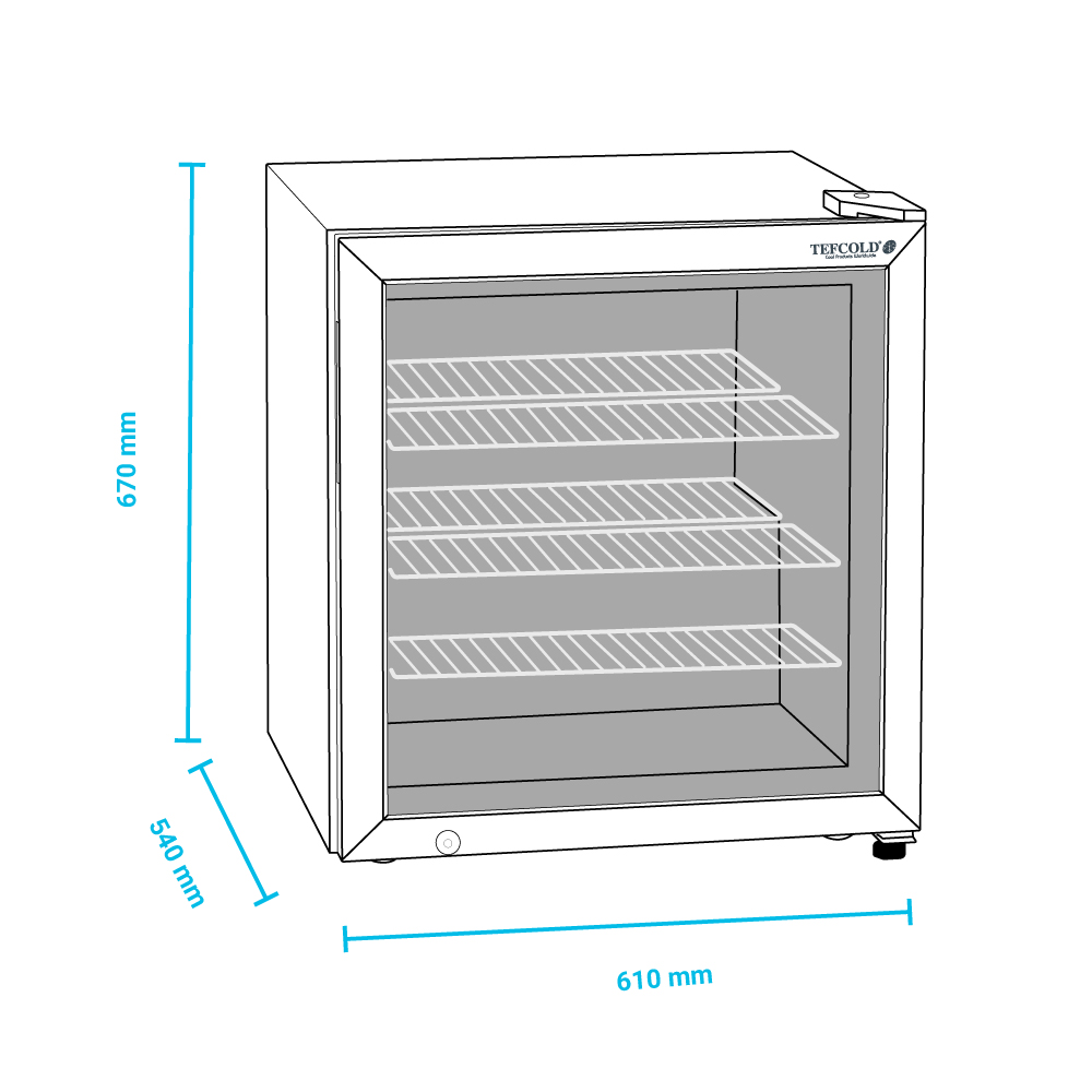 Εξωτερικές διαστάσεις 610x540x670(h)mm Εσωτερικές διαστάσεις 500x430x540(h)mm Χωρητικότητα 90 lt Θερμοκρασία -24ºC / -12ºC Ισχύς 230Watt / 220-240V / 50Hz Ψύξη Στατική Απόψυξη Χειροκίνητη Ψυκτικό υγρό R290 Ράφια 2(485x420mm) & 1(485x200mm) Φωτισμός LED Κλιματική κλάση 4 (+30ºC & 55&RH) Καθαρό Βάρος 44 Kg Aυτόματη επαναφορά πόρτας Μηχανικός θερμοστάτης Κλειδαριά 4 Ρυθμιζόμενα ποδαράκια