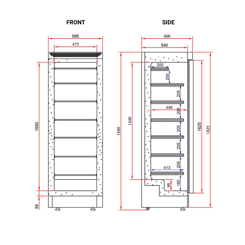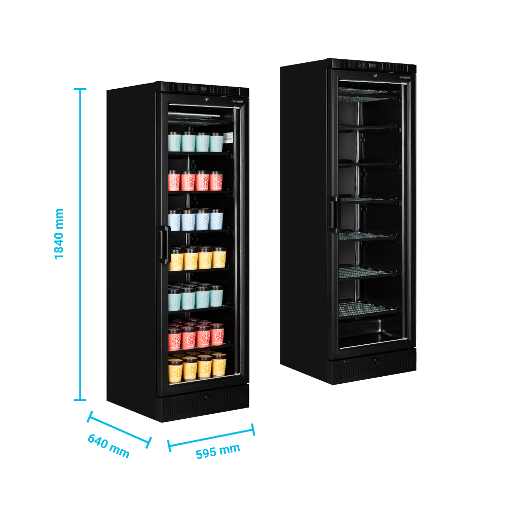 Εξωτερικές διαστάσεις 595x640x1840(h)mm Εσωτερικές διαστάσεις 470x440x1545(h)mm Χωρητικότητα 300 lt Θερμοκρασία -24ºC / -14ºC Ισχύς 570Watt / 220-240V / 50Hz Ψύξη Στατική Απόψυξη Χειροκίνητη Ψυκτικό υγρό R290 Ράφια 6 ψυχόμενα (470x413mm) Φωτισμός LED Κλιματική κλάση 4 (+30ºC & 55%RH) Καθαρό Βάρος 95 Kg Μηχανικός θερμοστάτης - ψηφιακό θερμόμετρο Κλειδαριά 2 ρυθμιζόμενα ποδαράκια & 2 ροδάκια
