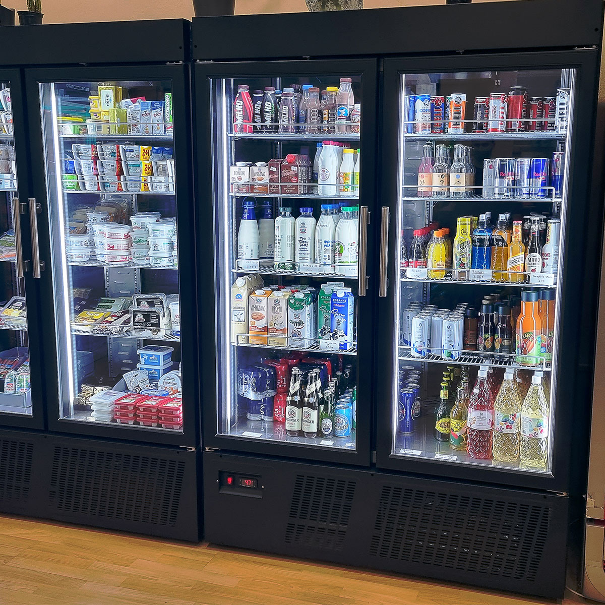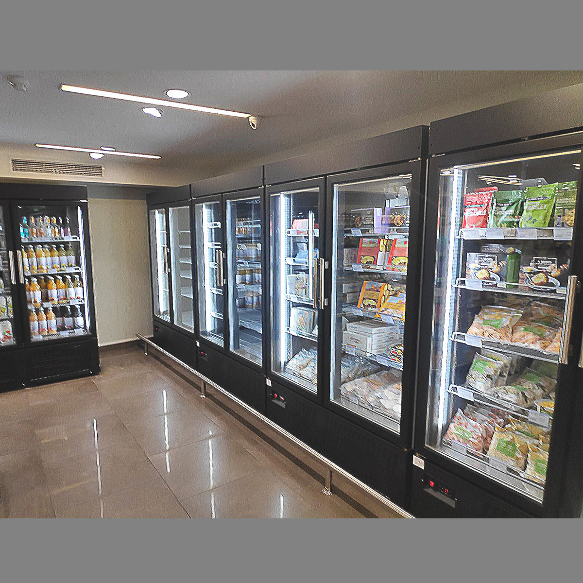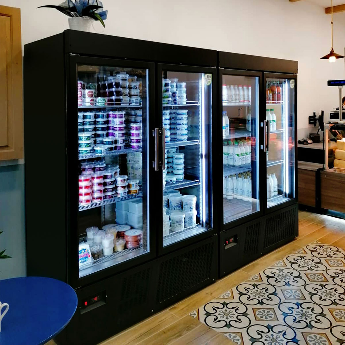 Κατασκευασμένο εξωτερικά από πλαστικοποιημένη λαμαρινα Μόνωση με οικολογική πολυουρεθάνη πάχους 7 cm στο σώμα και 8cm στο πάτο Εσωτερικός πάτος από ανοξείδοτο χάλυβα με υγειονομικές γωνίες Διπλά τζάμια στη συντήρηση και τριπλά τζάμια θερμαινόμενα στη κατάψυξη Σχάρες πλαστικοποιημένες ρυθμιζόμενες καθ’ ύψος Ρόδες και ποδαρικά Τερματικός διακόπτης που σταματάει την λειτουργία του στοιχείου με το άνοιγμα της πόρτας Φρέον οικολογικό Αγωγός αέρα για ομοιόμορφη κατανομή της ψύξης