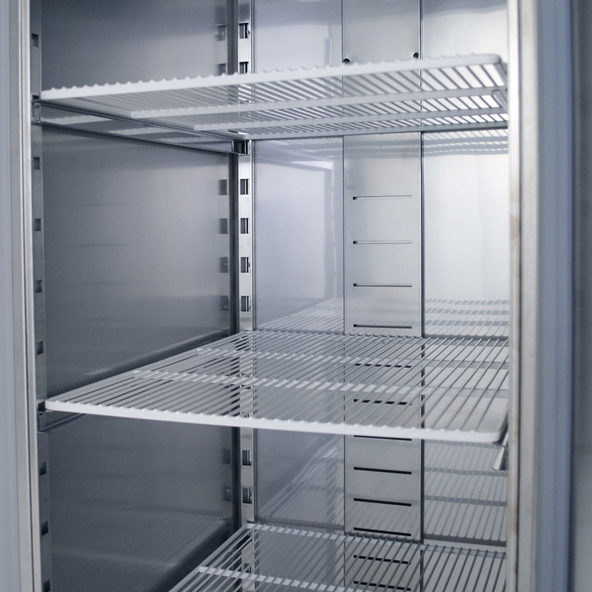 Κατασκευασμένο εσωτερικά και εξωτερικά από ανοξείδωτο χάλυβα Μόνωση με οικολογική πολυουρεθάνη πάχους 7 cm στο σώμα και 8cm στον πάτο Πάτος με υγειονομικές γωνίες Σχάρες πλαστικοποιημένες ρυθμιζόμενες καθ’ ύψος Οδηγοί Inox για GN λεκανάκια Πόδια ανοξείδωτα ρυθμιζόμενα Τερματικός διακόπτης που σταματάει την λειτουργία του στοιχείου με το άνοιγμα της πόρτας Φρέον οικολογικό Τοποθέτηση σωλήνα για τσιγκέλια Αγωγός αέρα για ομοιόμορφη κατανομή της ψύξης