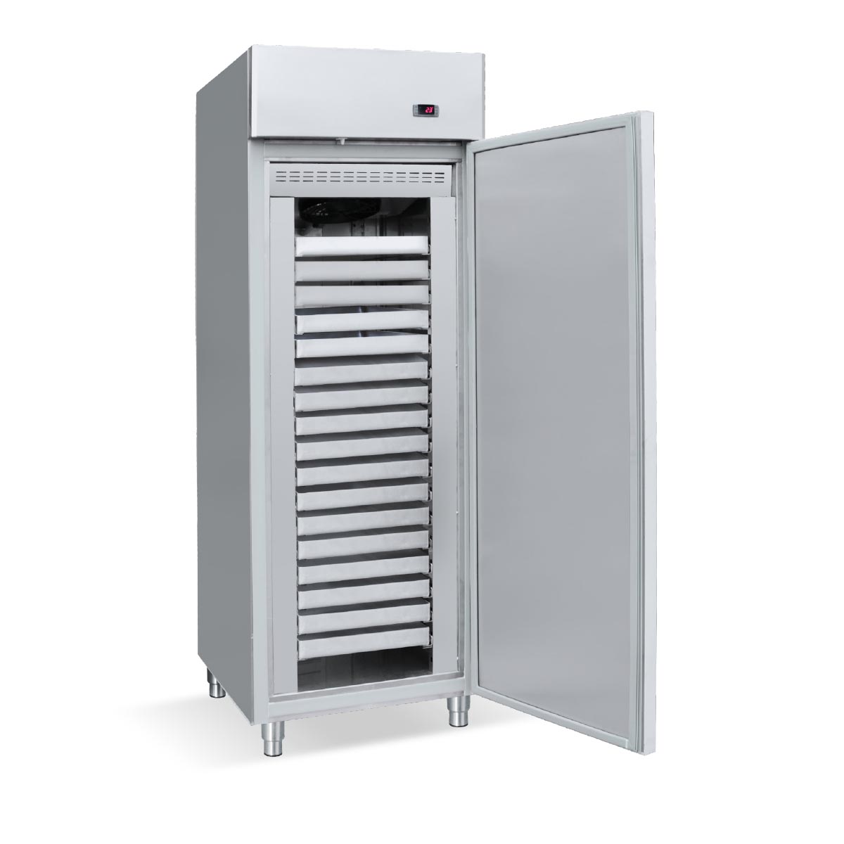 Κατασκευασμένο εσωτερικά και εξωτερικά από ανοξείδωτο χάλυβα Μόνωση με οικολογική πολυουρεθάνη πάχους 7 cm στο σώμα και 8 cm στο πάτο Πάτος με υγειονομικές γωνίες Εσωτερικά ανοξείδωτη κατασκευή με υποδοχές για 17 λαμαρίνες 40x60 Πόδια ανοξείδωτα ρυθμιζόμενα Τερματικός διακόπτης που σταματάει την λειτουργία του στοιχείου με το άνοιγμα της πόρτας Φρέον οικολογικό Αγωγός αέρα για ομοιόμορφη κατανομή της ψύξης