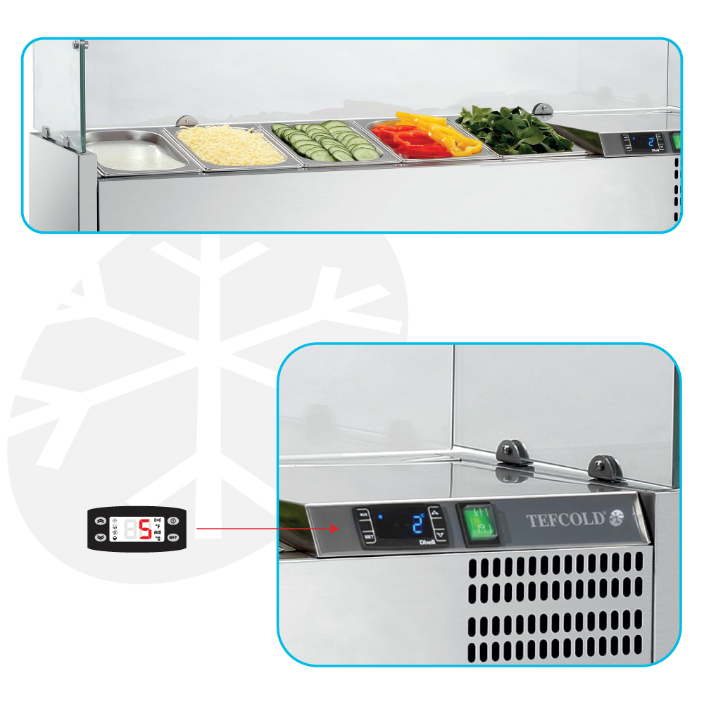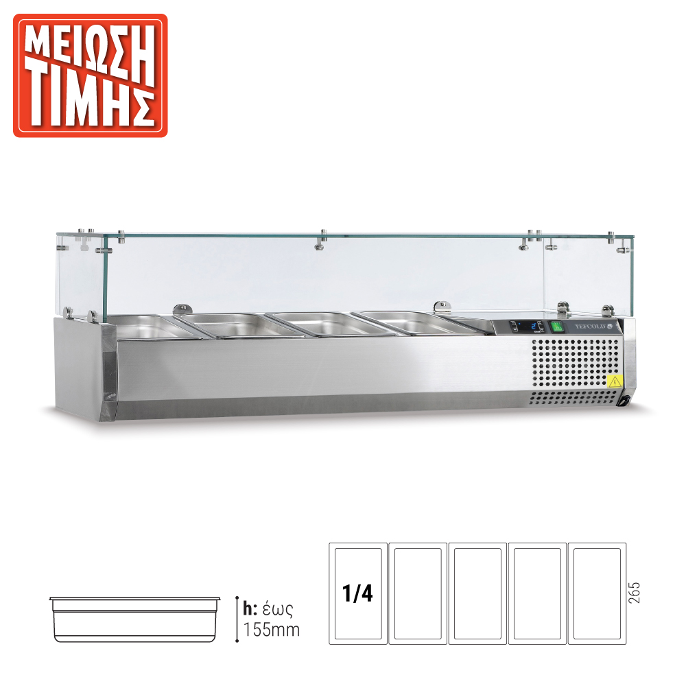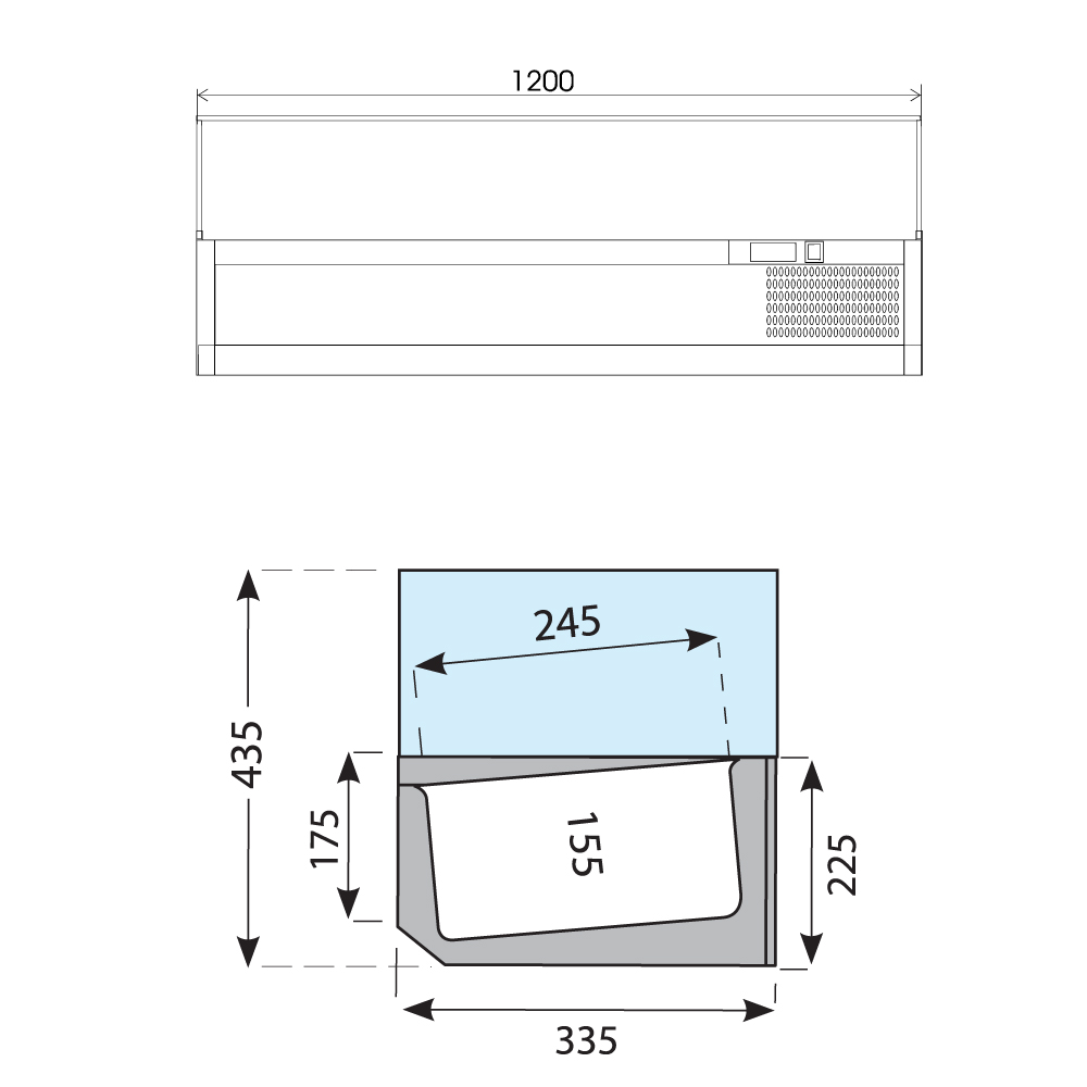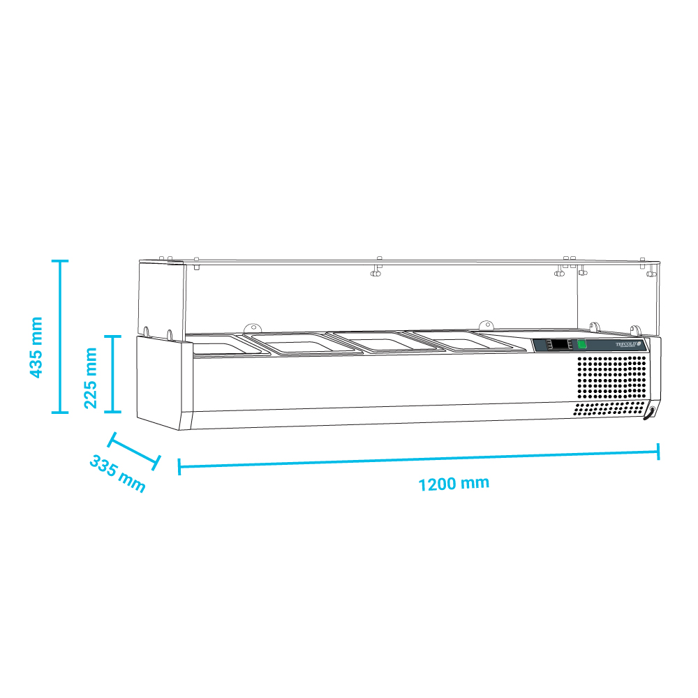 Εξωτερικές διαστάσεις (με τα τζάμια) 1200x335x225(435)(h)mm Εσωτερικές διαστάσεις 845x245x155(h)mm Αριθμός θέσεων για λεκανάκια GN 1/4 5 Θερμοκρασία +2ºC / +10 οC Ισχύς 112Watt / 220-240V / 50Hz Ψύξη Στατική Απόψυξη Χειροκίνητη Ψυκτικό υγρό R600a Κλιματική κλάση 4 (30°C & 55%RH) Καθαρό Βάρος 40 Kg Ηλεκτρονικός θερμοστάτης - θερμόμετρο 4 Ρυθμιζόμενα ποδαράκια Τα GN δεν περιλαμβάνονται