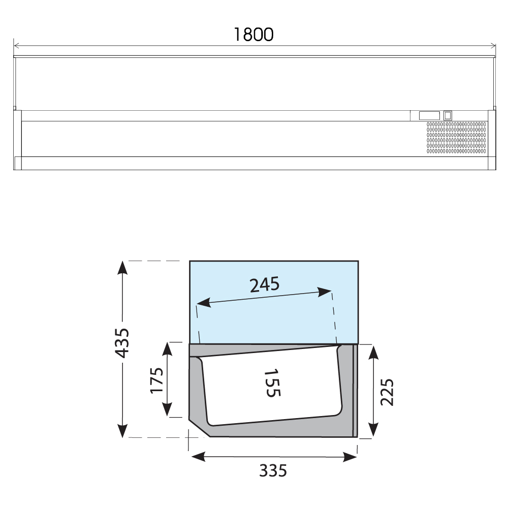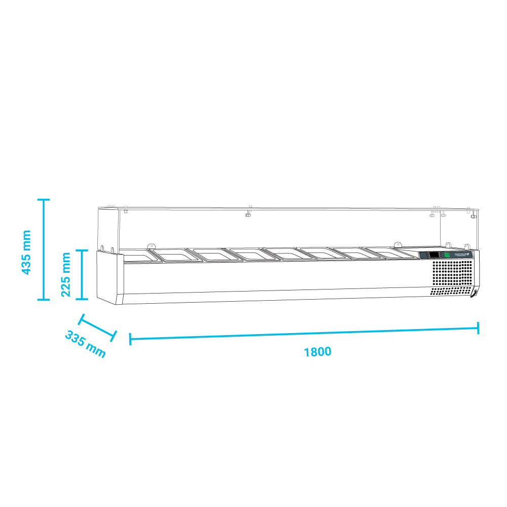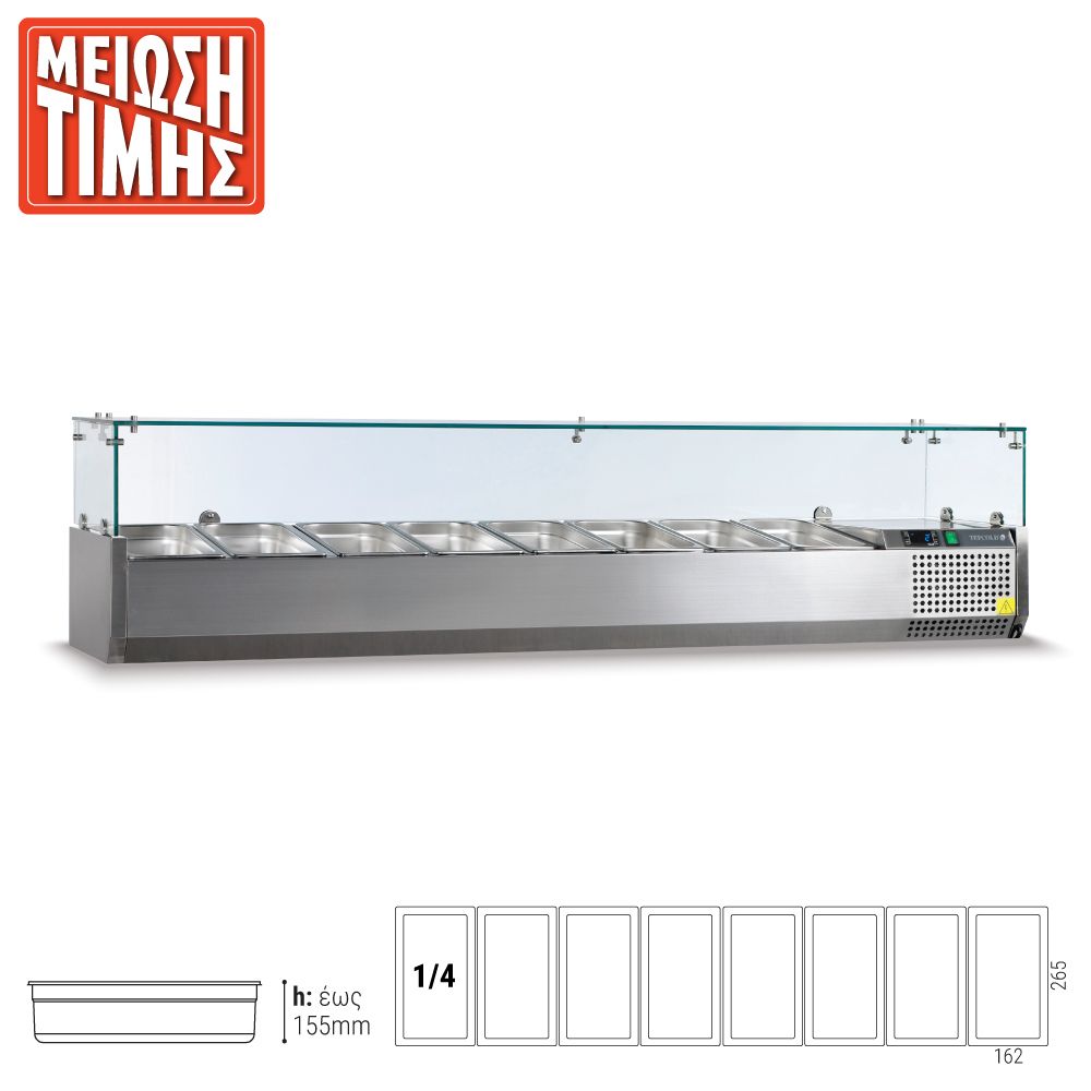 Εξωτερικές διαστάσεις (με τα τζάμια) 1800x335x225(435)(h)mm Εσωτερικές διαστάσεις 1445x245x155(h)mm Αριθμός θέσεων για λεκανάκια GN 1/4 8 Θερμοκρασία +2ºC / +10οC Ισχύς 112Watt / 220-240V / 50Hz Ψύξη Στατική Απόψυξη Χειροκίνητη Ψυκτικό υγρό R600a Κλιματική κλάση 4 (30°C & 55%RH) Καθαρό Βάρος 53 Kg Ηλεκτρονικός θερμοστάτης - θερμόμετρο 4 Ρυθμιζόμενα ποδαράκια Τα GN δεν περιλαμβάνονται