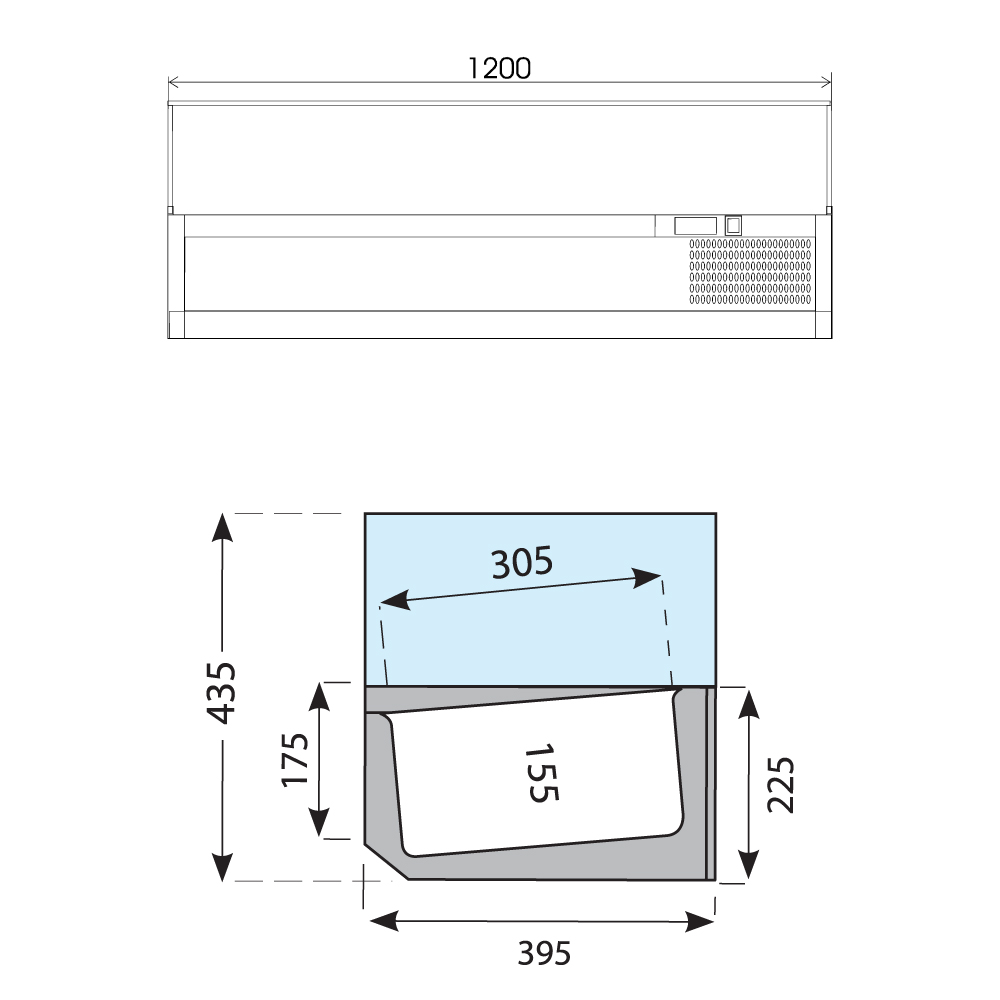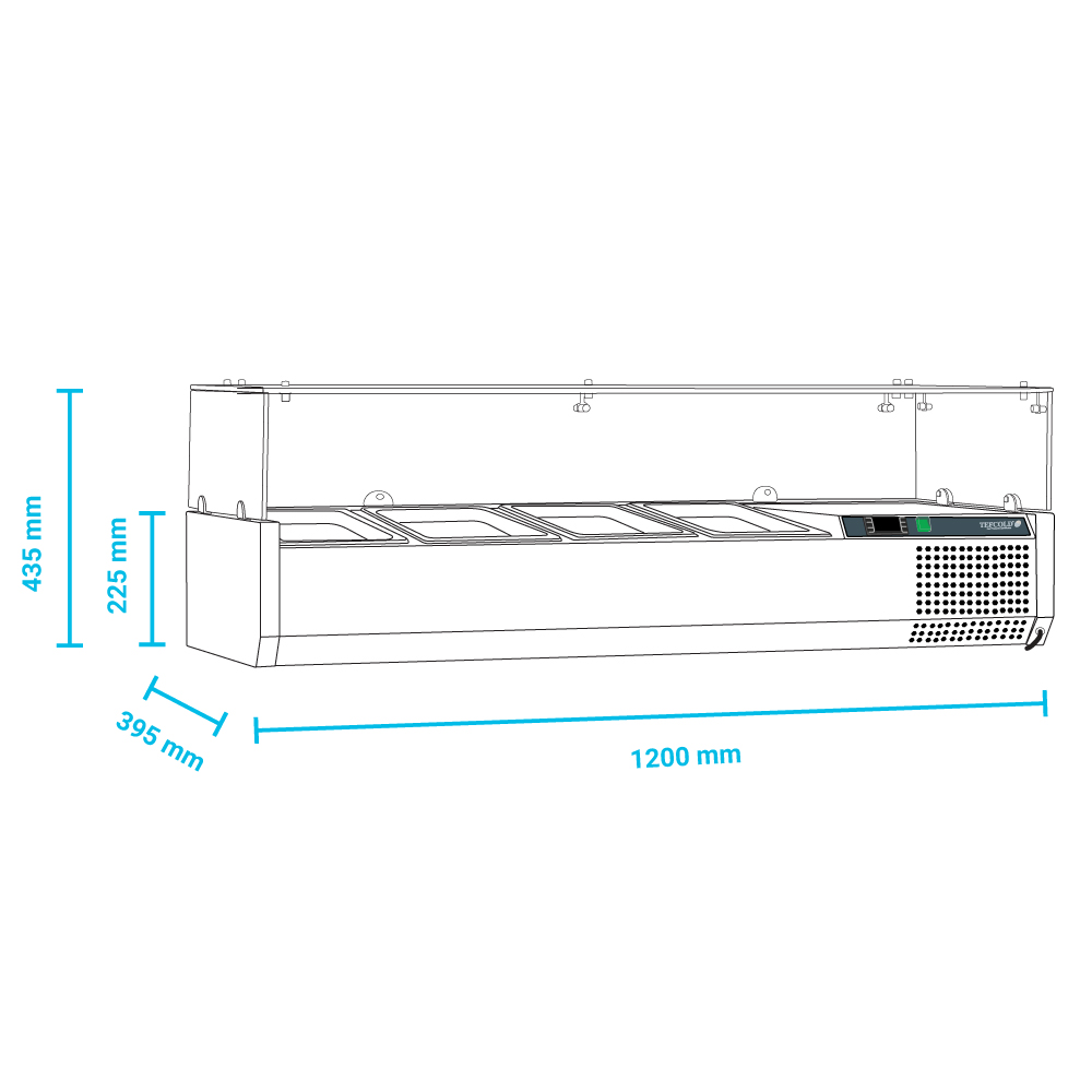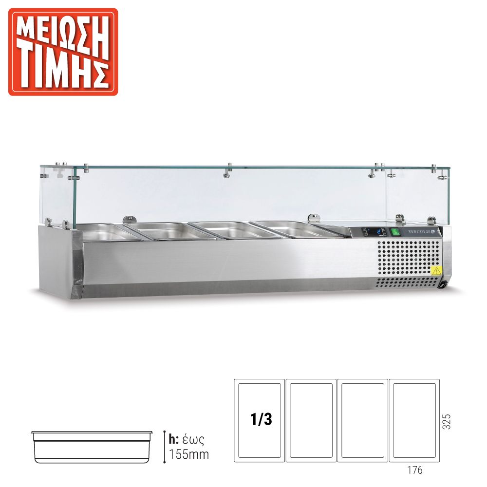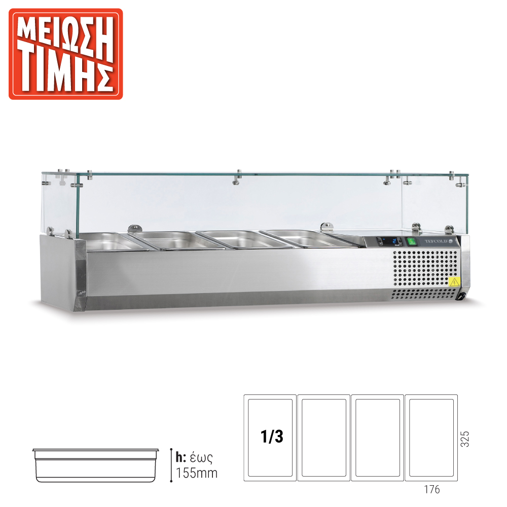 Εξωτερικές διαστάσεις (με τα τζάμια) 1200x395x225(435)(h)mm Εσωτερικές διαστάσεις 845x305x155(h)mm Αριθμός θέσεων για λεκανάκια GN 1/3 4 Θερμοκρασία +2ºC / +10οC Ισχύς 112Watt / 220-240V / 50Hz Ψύξη Στατική Απόψυξη Χειροκίνητη Ψυκτικό υγρό R600a Κλιματική κλάση 4 (30°C & 55%RH) Καθαρό Βάρος 40 Kg Ηλεκτρονικός θερμοστάτης - θερμόμετρο 4 Ρυθμιζόμενα ποδαράκια Τα GN δεν περιλαμβάνονται