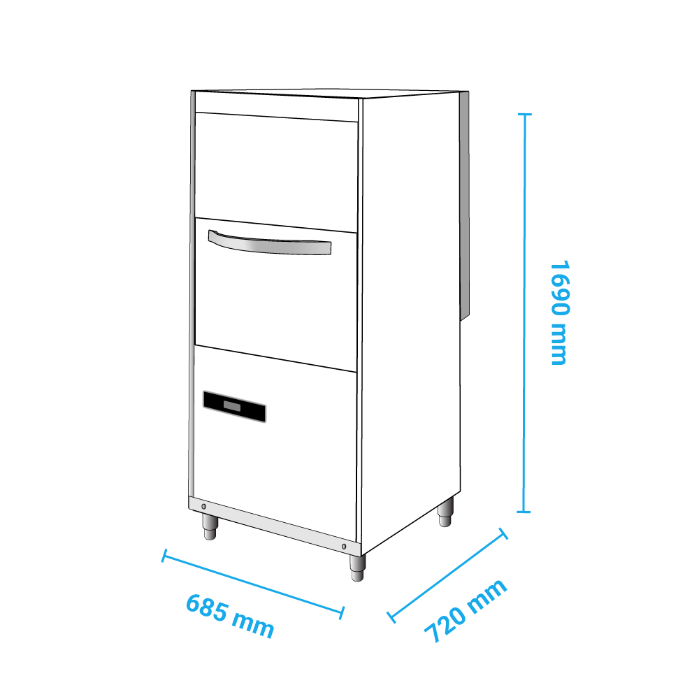 Διαστάσεις 685x720x1690(h)mm Ωφ. Ύψος 620mm Καλάθι 570x620mm Χωρητικότητα κάδου 30 Lt Κύκλος πλύσης 60/ 120 / 180 / 480 sec Ισχύς 11400W / 400V / 3N / 50Hz Αντίσταση κάδου 3.000 Watt Αντίσταση Boiler 10.000 Watt Αντλία πλύσης 1,42 KWatt Κατασκευή εξ ολοκλήρου INOX Διπλά τοιχώματα Με αντλία εξισορρόπησης πίεσης Πλύση & Απόπλυση: πάνω-κάτω Ενδείκνυται η τροφοδοσία με νερό θερμοκρασίας έως 55°C. Περιλαμβάνεται 1 καλάθι πιάτων 24 θέσεων , 1 καλάθι γενικής χρήσης & 1 καλάθι για λαμαρίνες 9 θέσεων