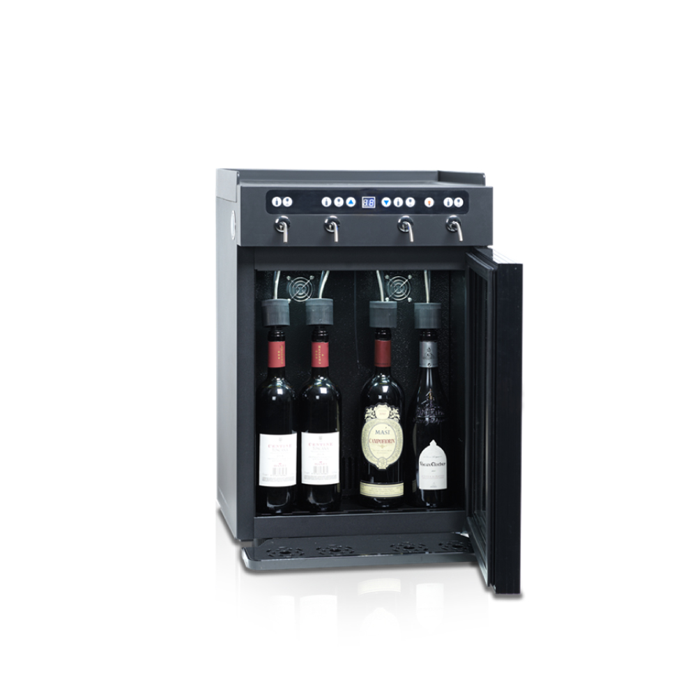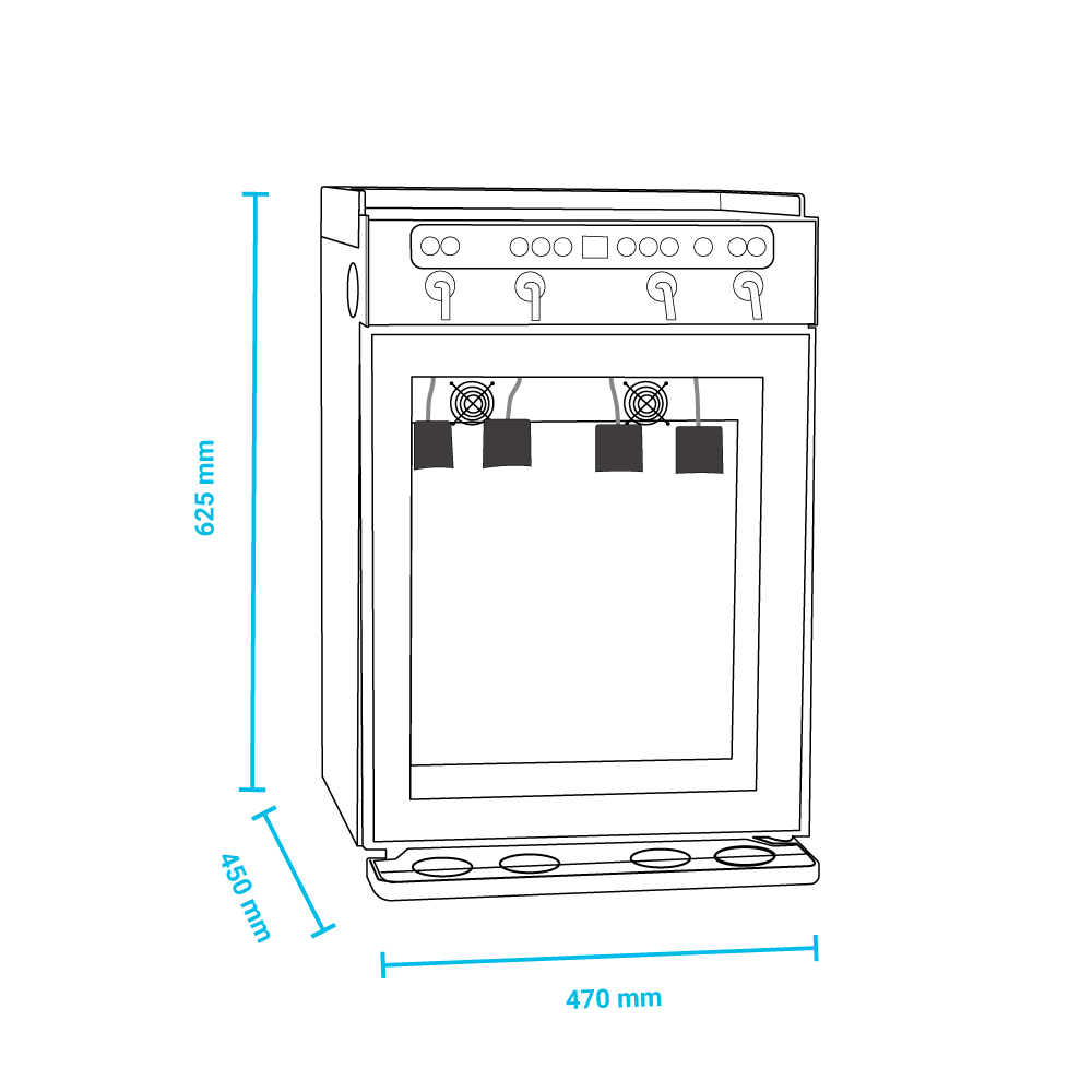 Εξωτερικές διαστάσεις 470x450x625(h)mm Χωρητικότητα 4 φιάλες Θερμοκρασία +7ºC / +18οC Ισχύς 120Watt / 220-240V / 50 Hz Ψύξη Στατική Απόψυξη Αυτόματη Ψυκτικό υγρό R600a Φωτισμός LED Κλιματική κλάση 3 (+25°C & 60% RH) Βάρος 28 Kg Ηλεκτρονικό Θερμόμετρο / Ηλεκτρονικός Θερμοστάτης 4 ποδαράκια