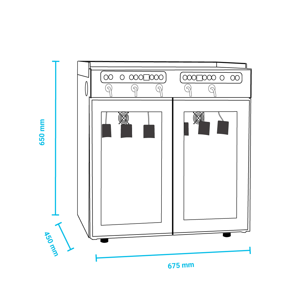 Εξωτερικές διαστάσεις 675x450x650(h)mm Χωρητικότητα 6 φιάλες Θερμοκρασία +7ºC / +18οC Ισχύς 120Watt / 220-240V / 50 Hz Ψύξη Στατική Απόψυξη Αυτόματη Ψυκτικό υγρό R600a Φωτισμός LED Κλιματική κλάση 3 (+25°C & 60% RH) Βάρος 47 Kg Ηλεκτρονικό Θερμόμετρο / Ηλεκτρονικός Θερμοστάτης 4 ποδαράκια