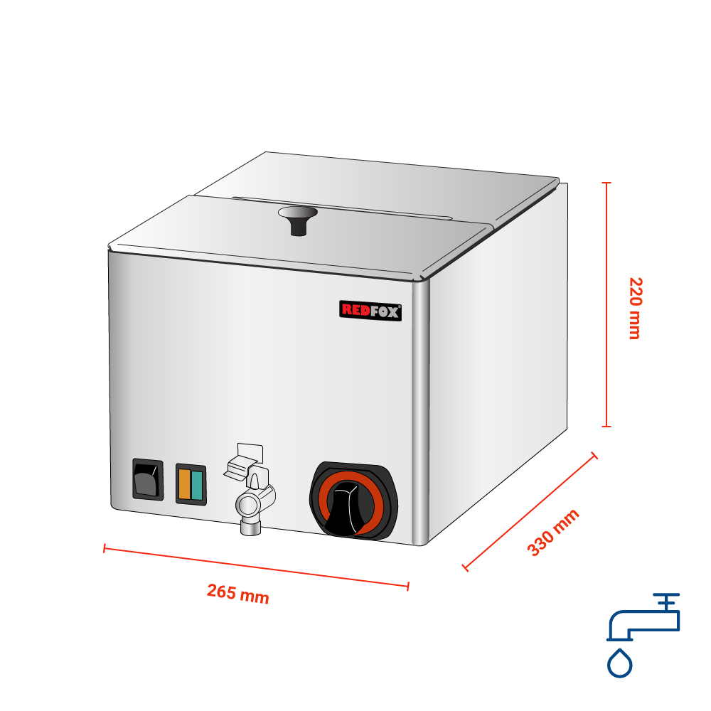 Διαστάσεις 265x330x220(h)mm Ισχύς 1 KWatt, 230V / 50Hz Θερμοκρασία 30 - 90oC Χωρητικότητα 1 x GN 1/2 (h: 150mm) Κωδικός προϊόντος 102500105 Διάτρητη βάση-σχάρα αποστράγγισης στο εσωτερικό Κατασκευή Inox