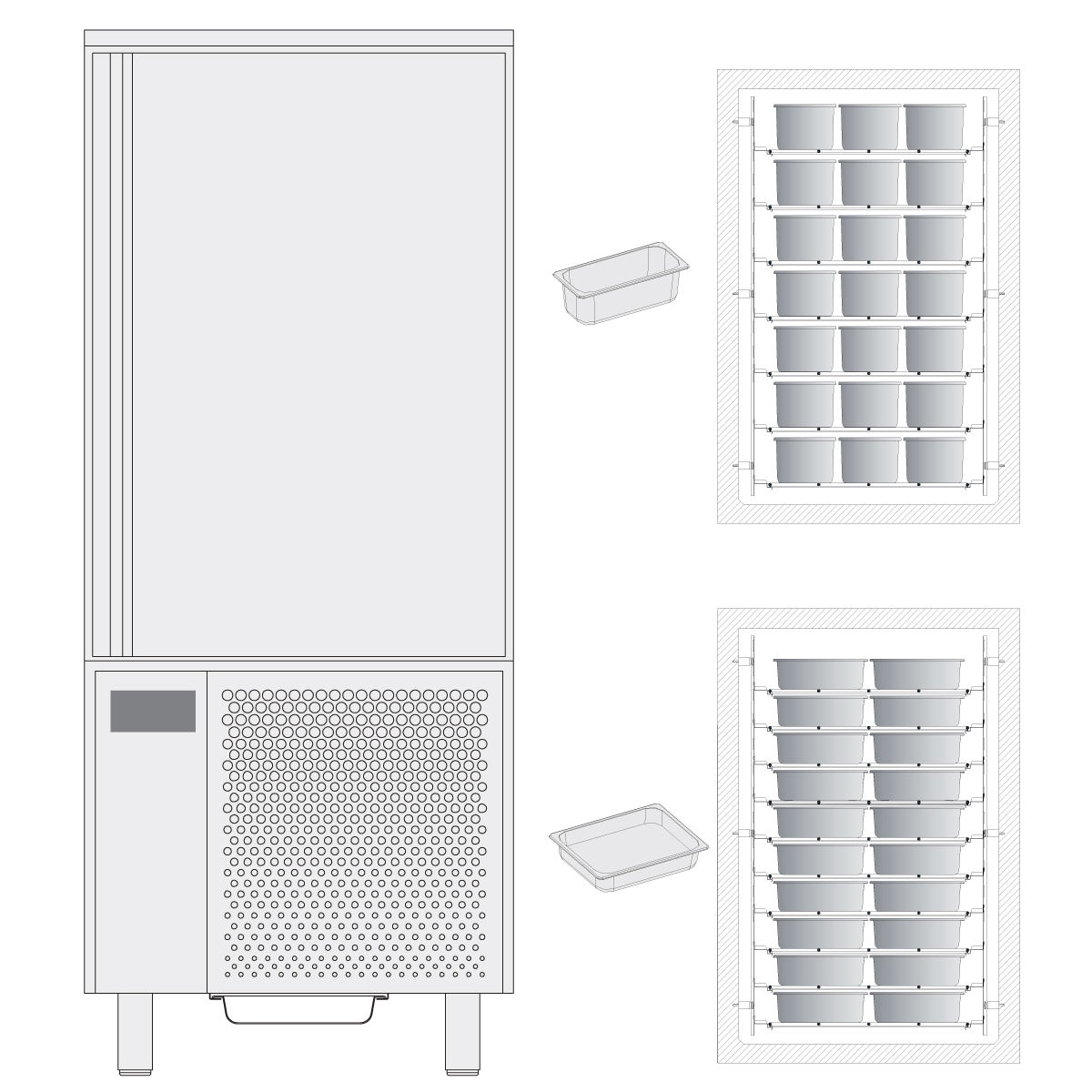 Διαστάσεις 800x822x1890(h)mm Χωρητικότητα 16 GN 1/1 ή 16 ταψιά 400x600 ή 24 λεκανάκια παγωτού (5lt) Ικανότητα Ψύξης 70 kg σε 90' (+65oC σε +10oC) Ικανότητα Κατάψυξης 55 kg σε 240' (+65oC έως -18oC) Ψύξη Βεβιασμένη Απόψυξη Αυτόματη (με Hot Gas) Ισχύς 3000 Watt, 230V / 50Hz Ψυκτικό υγρό R290 Κλιματική κλάση 4 (30°C & 55%RH) Απόσταση λαμαρίνων 65mm Τα λεκανάκια παγωτού, τα GN και οι λαμαρίνες δε συμπεριλαμβάνονται