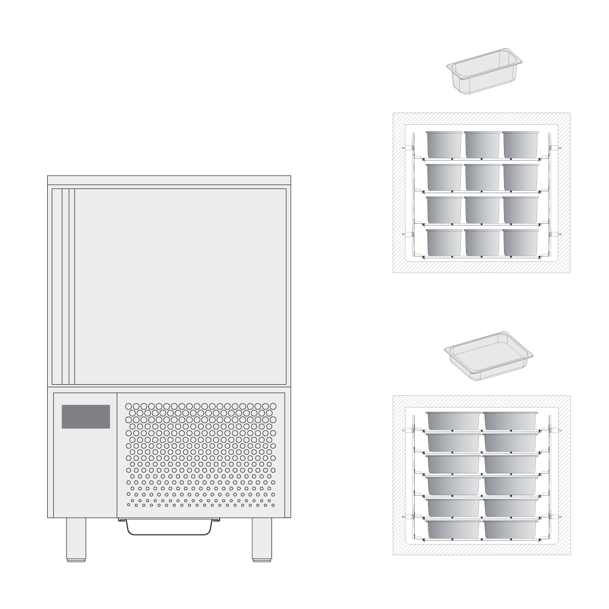 Διαστάσεις 800x822x1450(h)mm Χωρητικότητα 8 GN 1/1 ή 8 ταψιά 400x600 ή 12 λεκανάκια παγωτού (5lt) Ικανότητα Ψύξης 35 kg σε 90' (+65oC σε +10oC) Ικανότητα Κατάψυξης 20 kg σε 240' (+65oC έως -18oC) Ψύξη Βεβιασμένη Απόψυξη Αυτόματη (με Hot Gas) Ισχύς 1570 Watt, 230V / 50Hz Ψυκτικό υγρό R290 Κλιματική κλάση 4 (30°C & 55%RH) Απόσταση λαμαρίνων 65mm Τα λεκανάκια παγωτού, τα GN και οι λαμαρίνες δε συμπεριλαμβάνονται